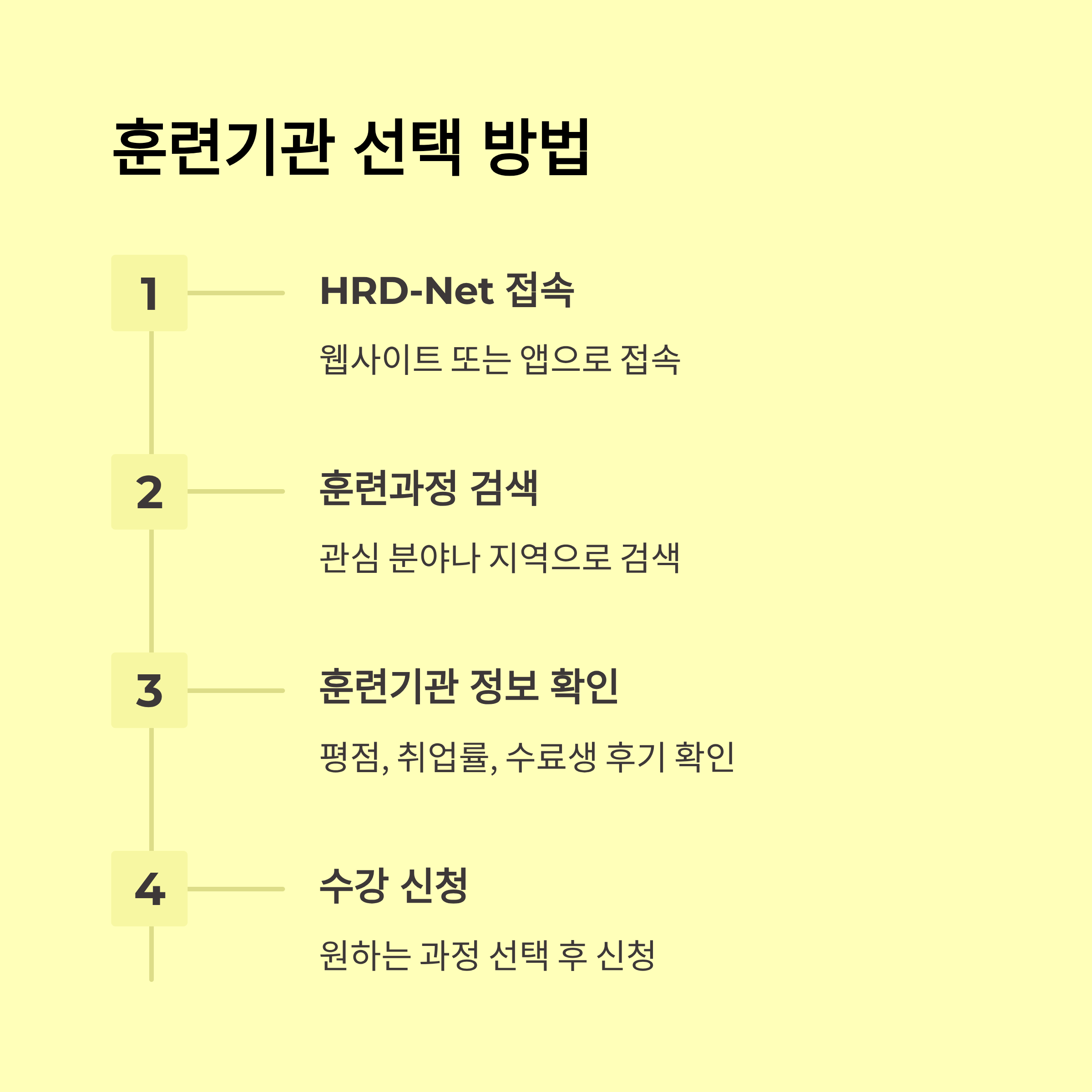 ✔ 훈련 과정은 HRD-Net에서 별점 높은 기관 위주로 선택하는 것이 좋아요. 수료율과 자격증 취득률이 높은 곳은 이후 취업에도 유리해요.