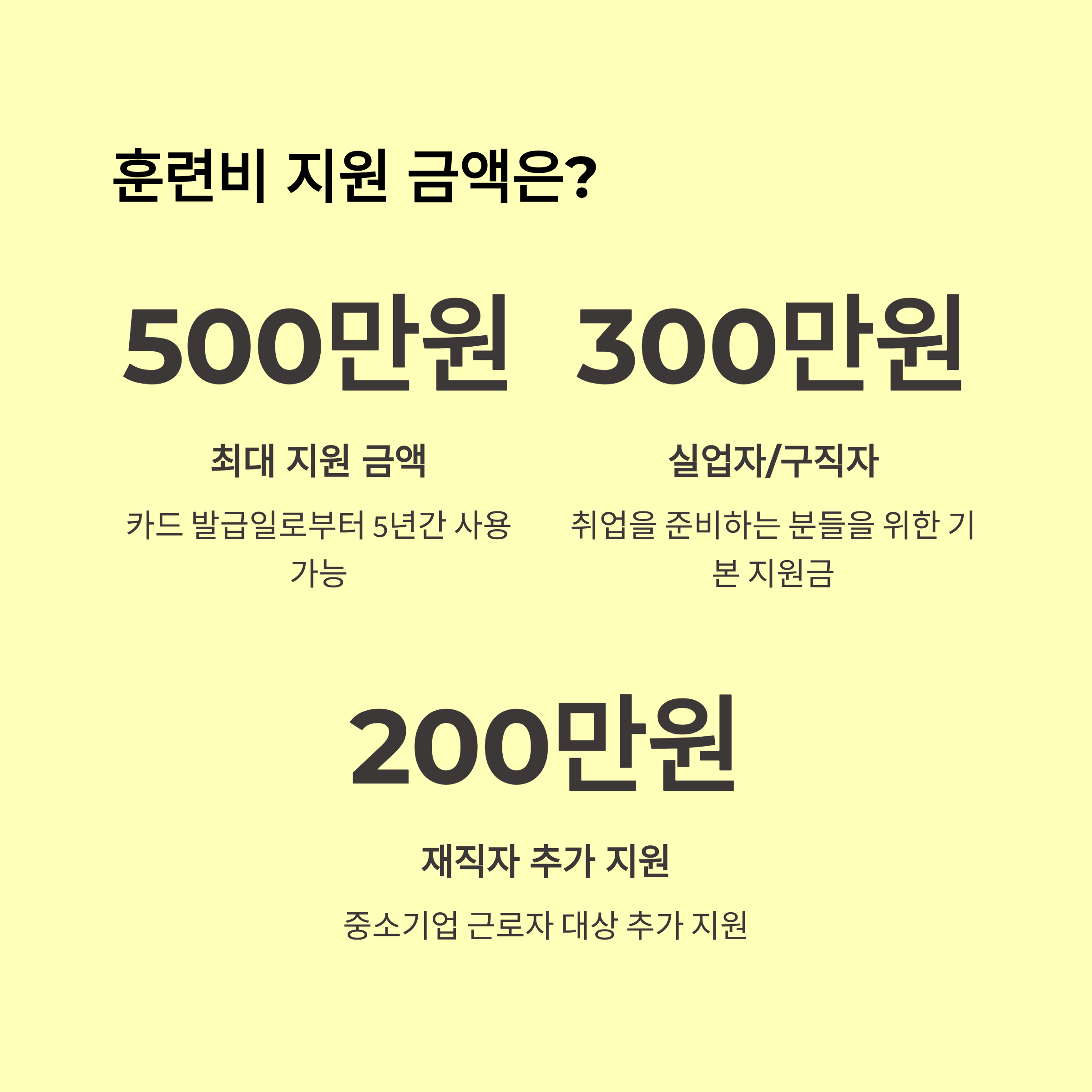 국민내일배움카드를 통해 받을 수 있는 훈련비는 기본 300만원이에요. 여기에 추가적으로 100~200만원까지의 추가지원이 가능해서, 최대 500만원까지 훈련비를 받을 수 있어요.