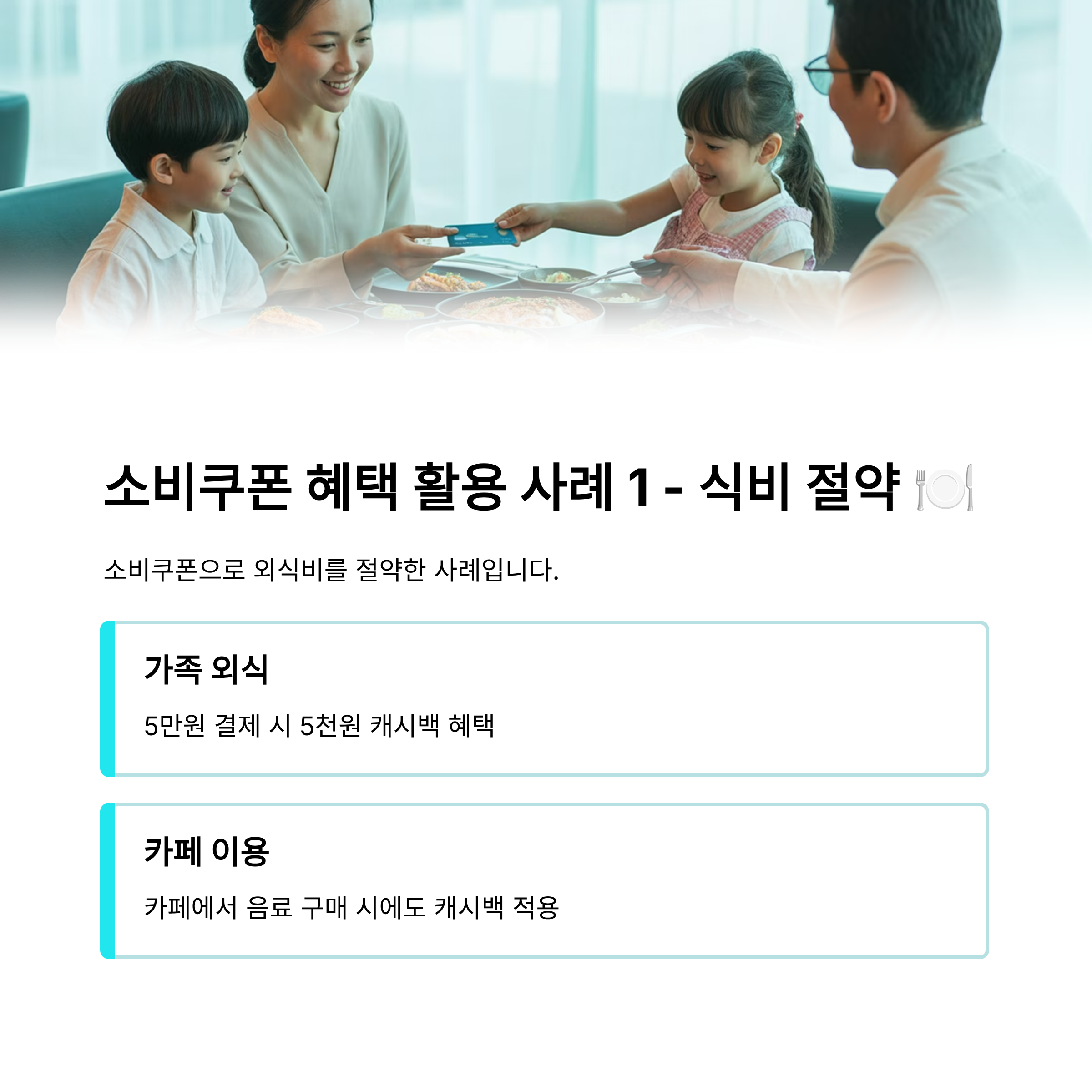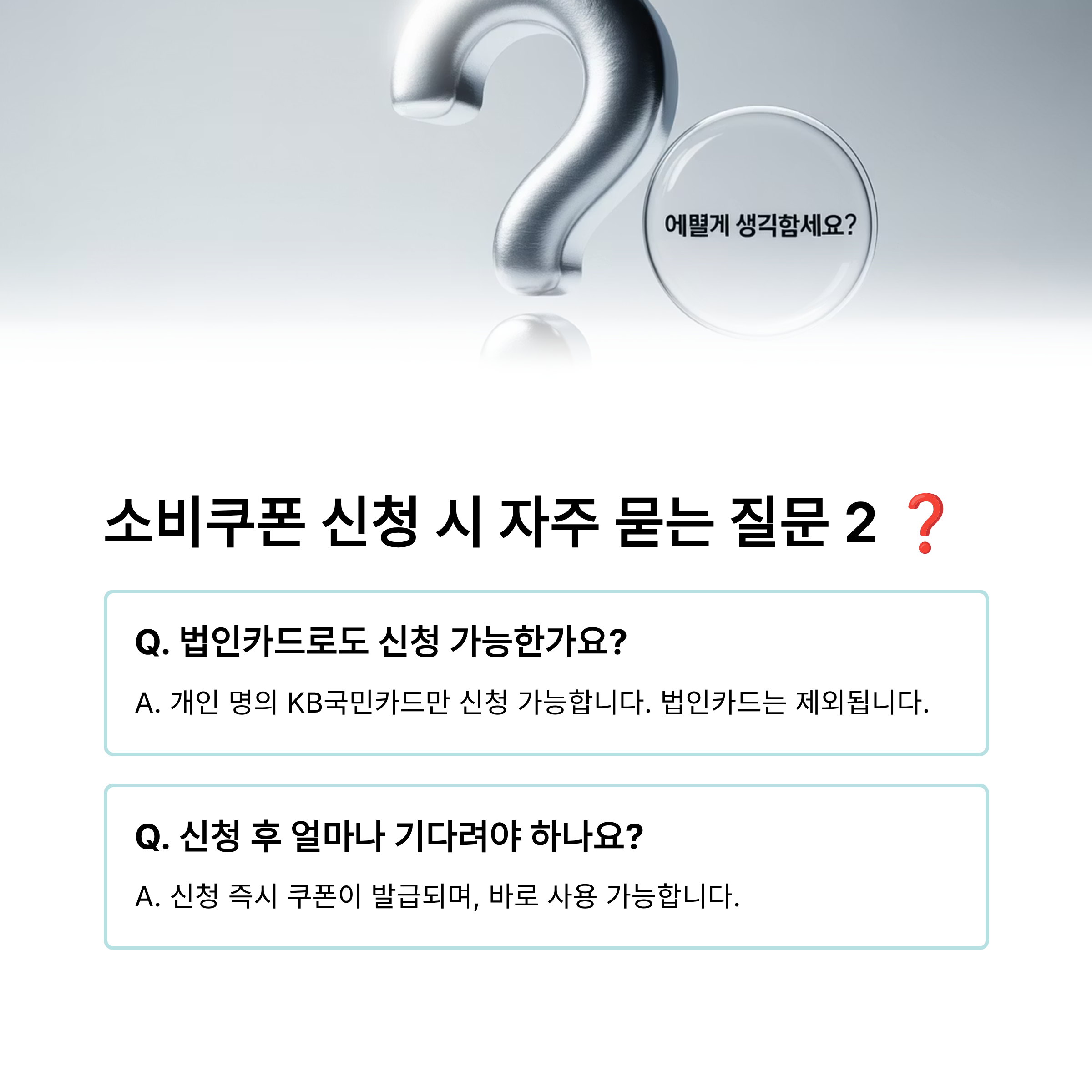 A. 불가능합니다. 민생회복 소비쿠폰은 개인에게 지급되는 지원금이므로, 개인 명의의 신용/체크카드로만 신청할 수 있습니다. 법인카드, 가족카드는 신청 대상이 아닙니다.