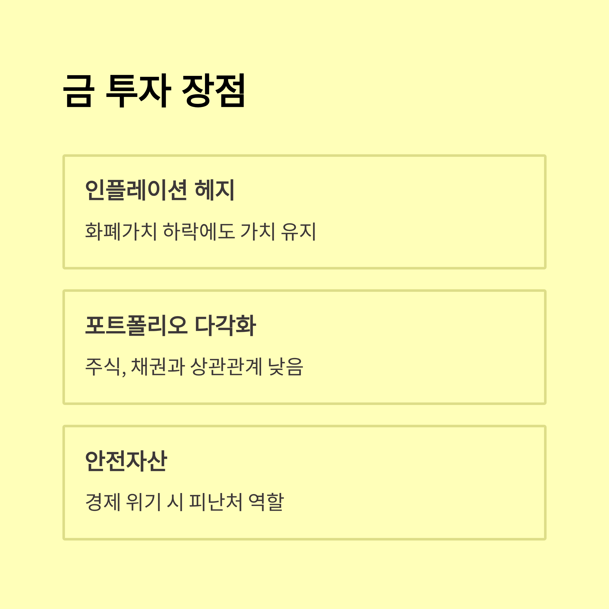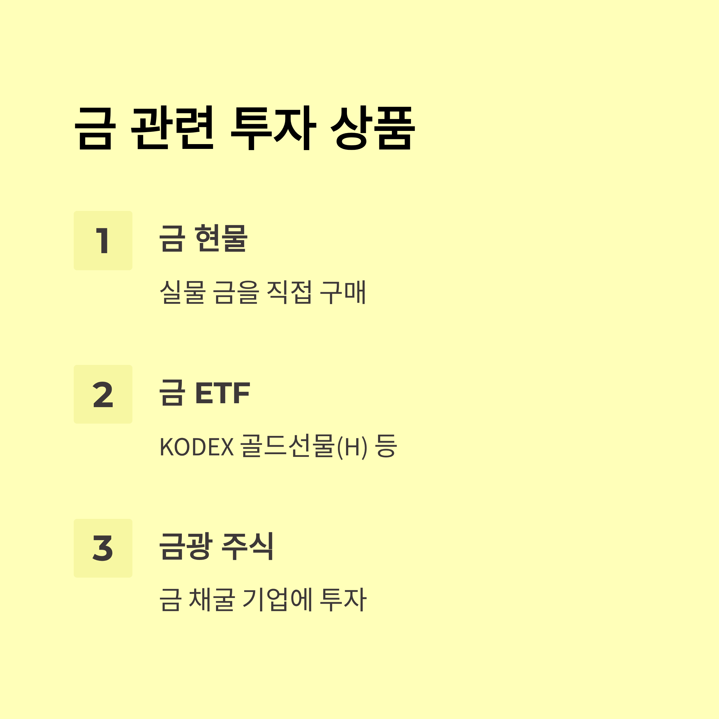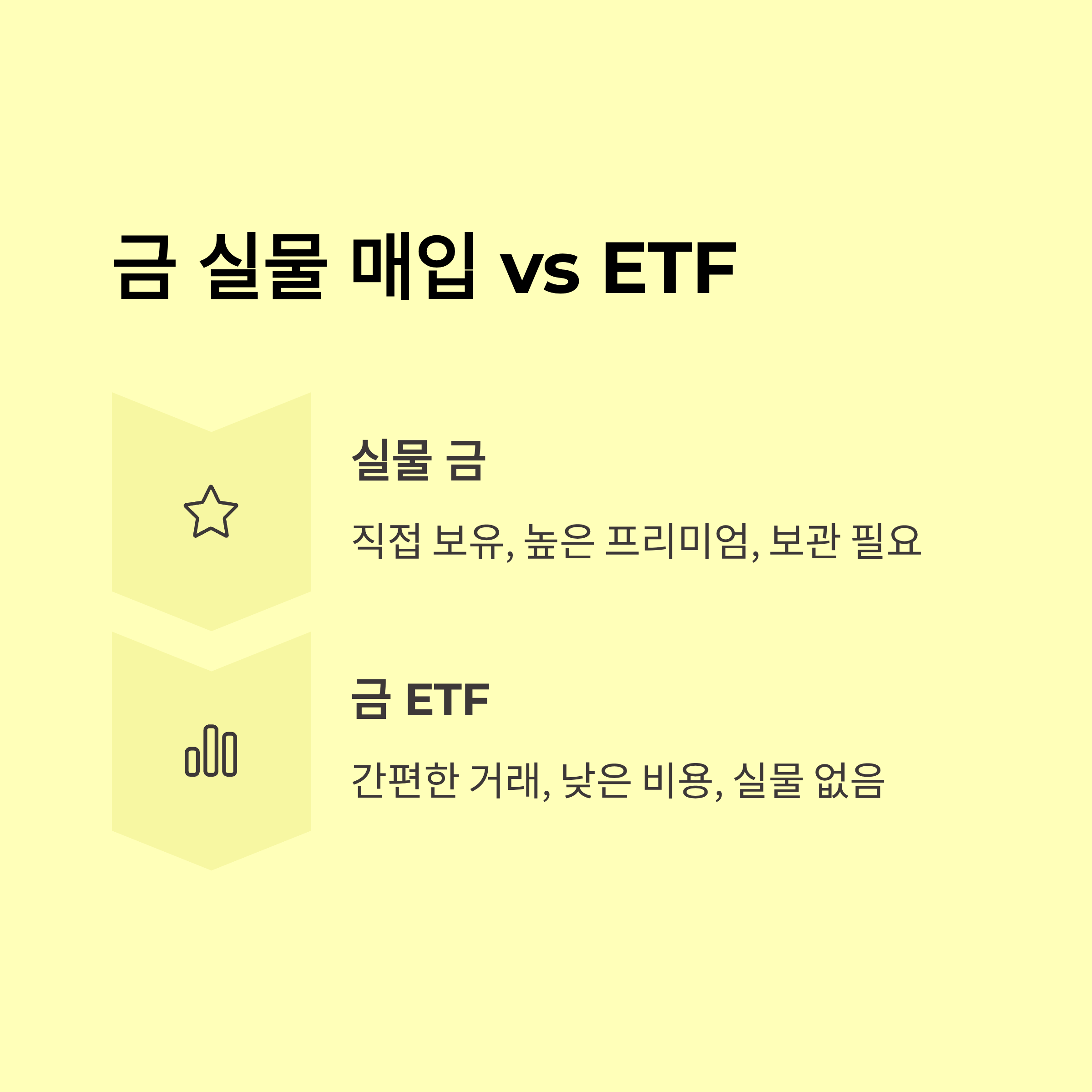 - ETF/금통장 : 거래 비용 저렴, 0.01g 단위로 투자 가능, 환금성/유동성 우수. 단, KRX 금현물은 실물인출시 별도 조건, 미국 ETF(대표 GLD, IAU)는 환율/외화 계좌 필요