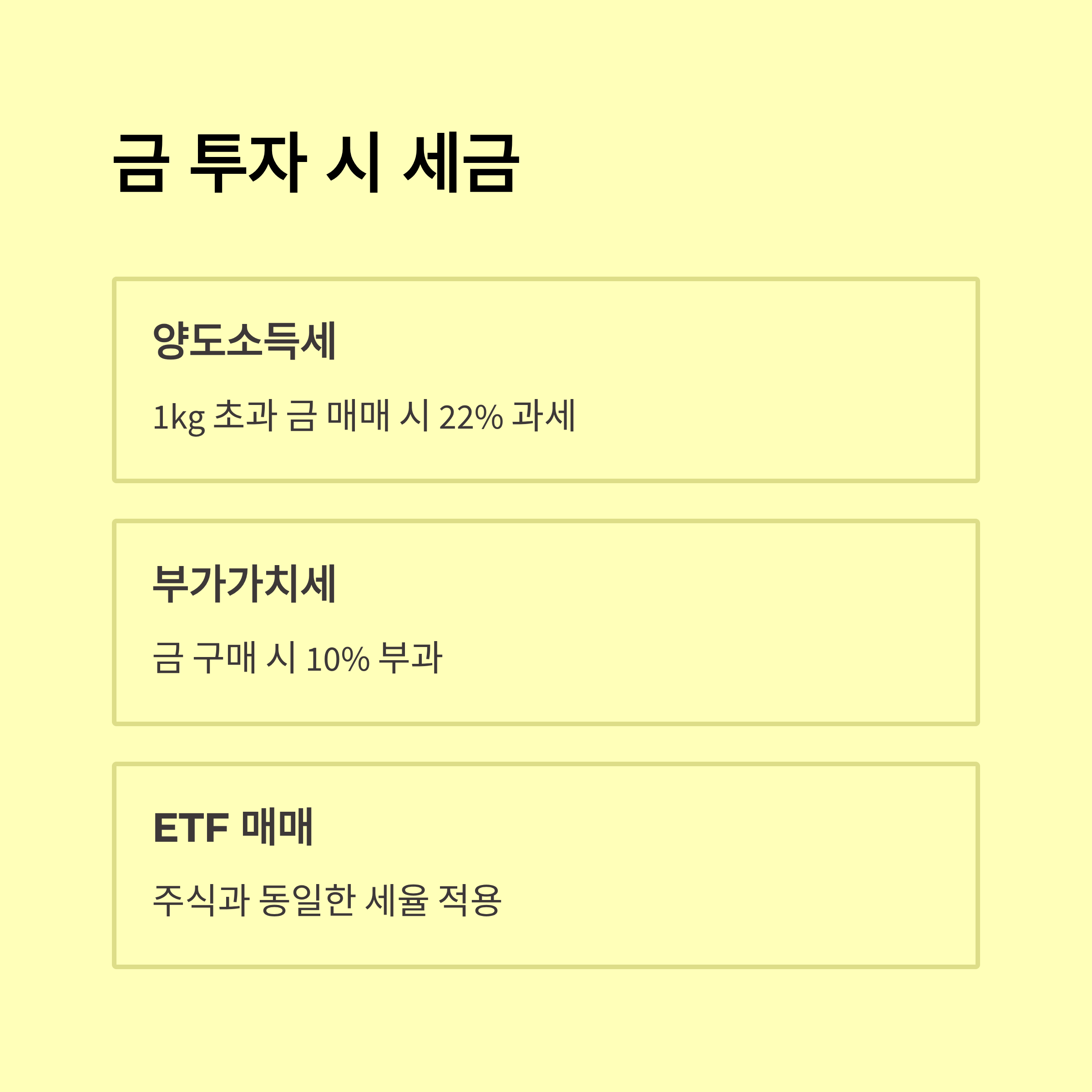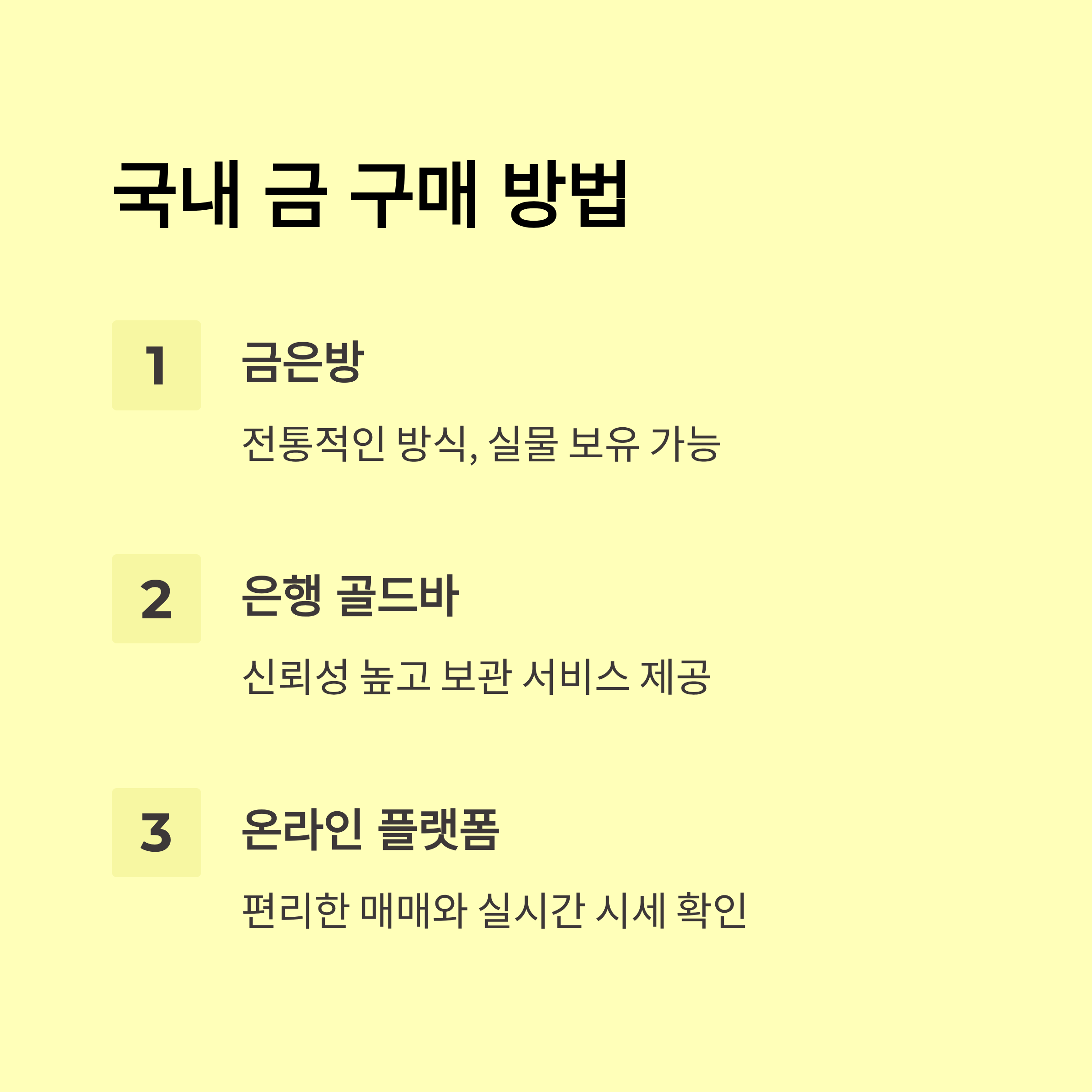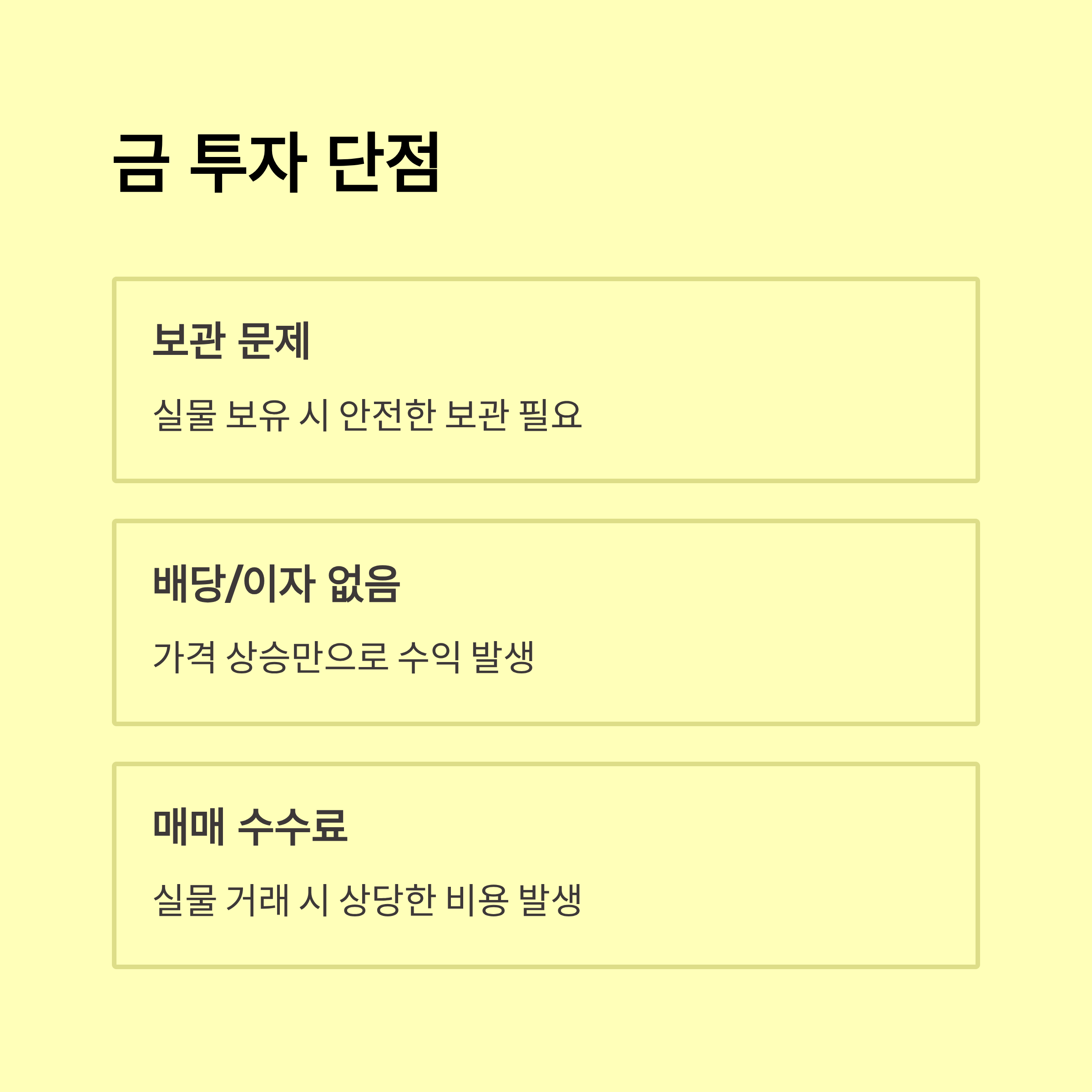 - ETF/금통장 : 거래 비용 저렴, 0.01g 단위로 투자 가능, 환금성/유동성 우수. 단, KRX 금현물은 실물인출시 별도 조건, 미국 ETF(대표 GLD, IAU)는 환율/외화 계좌 필요