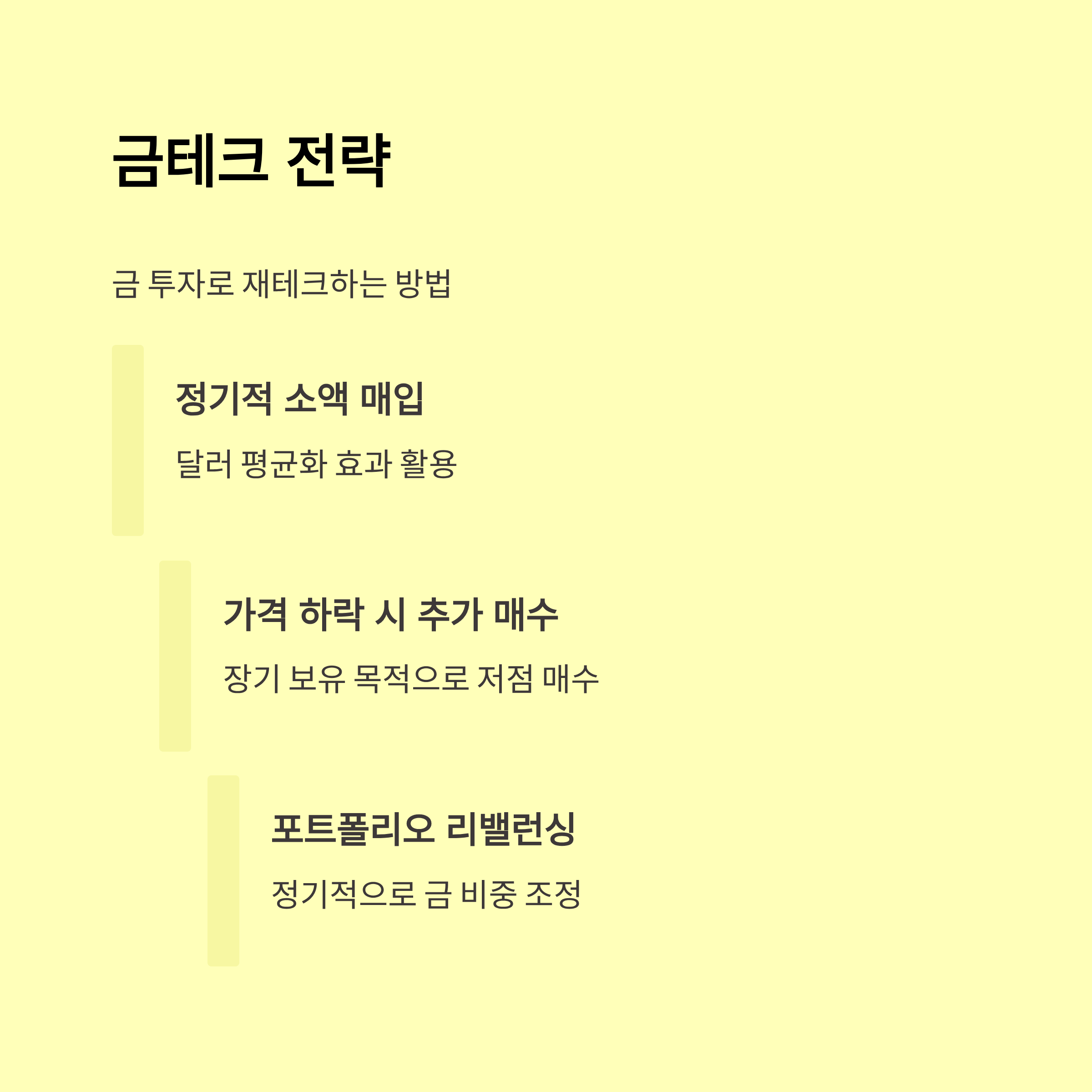 - 투자상품 다양화: 실물(한돈/골드바), KRX 금, ETF, 뱅킹 모두 조합, 분할매수·분할매도·현금 병행