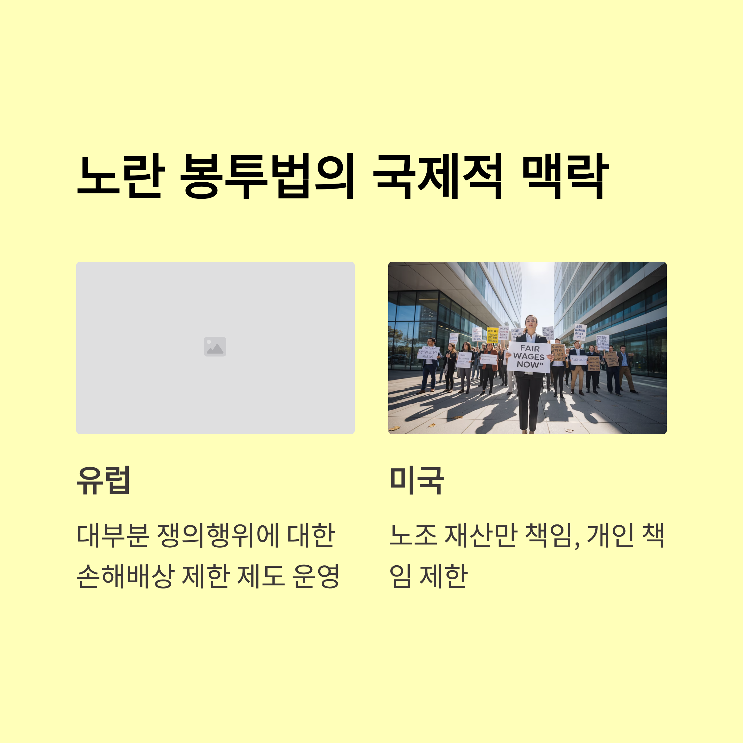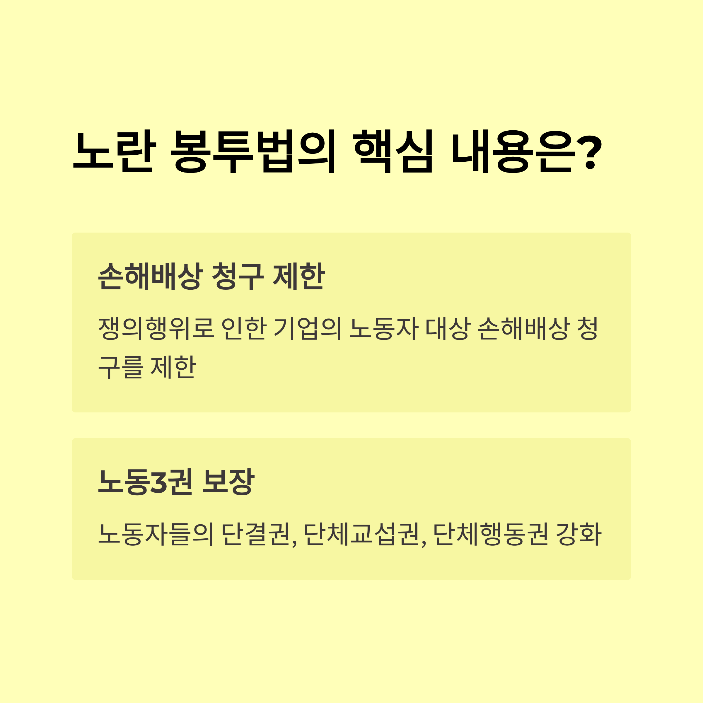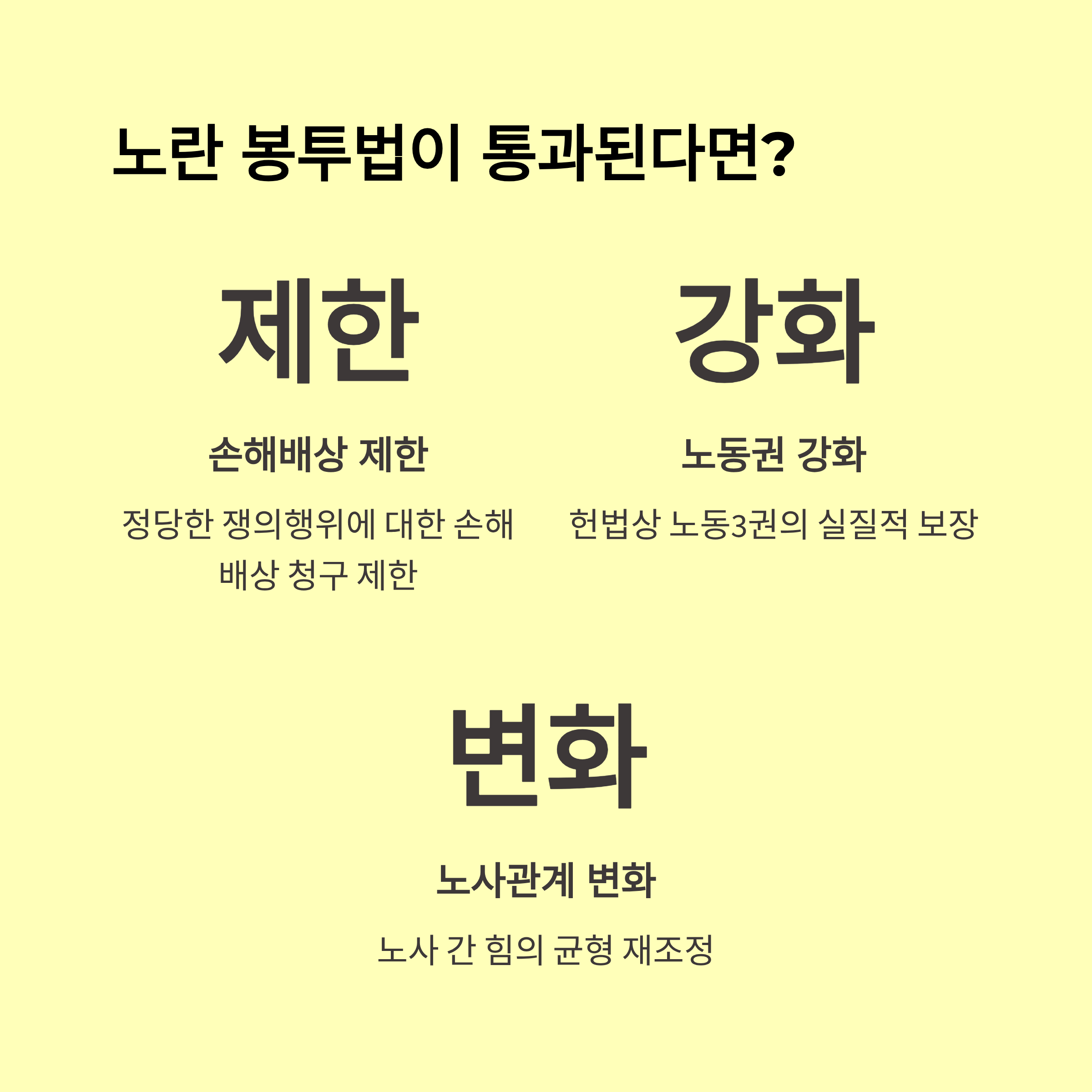 - 노동자 입장: 합법적 파업·쟁의 보호 강화, 과도 손배 금지 필수