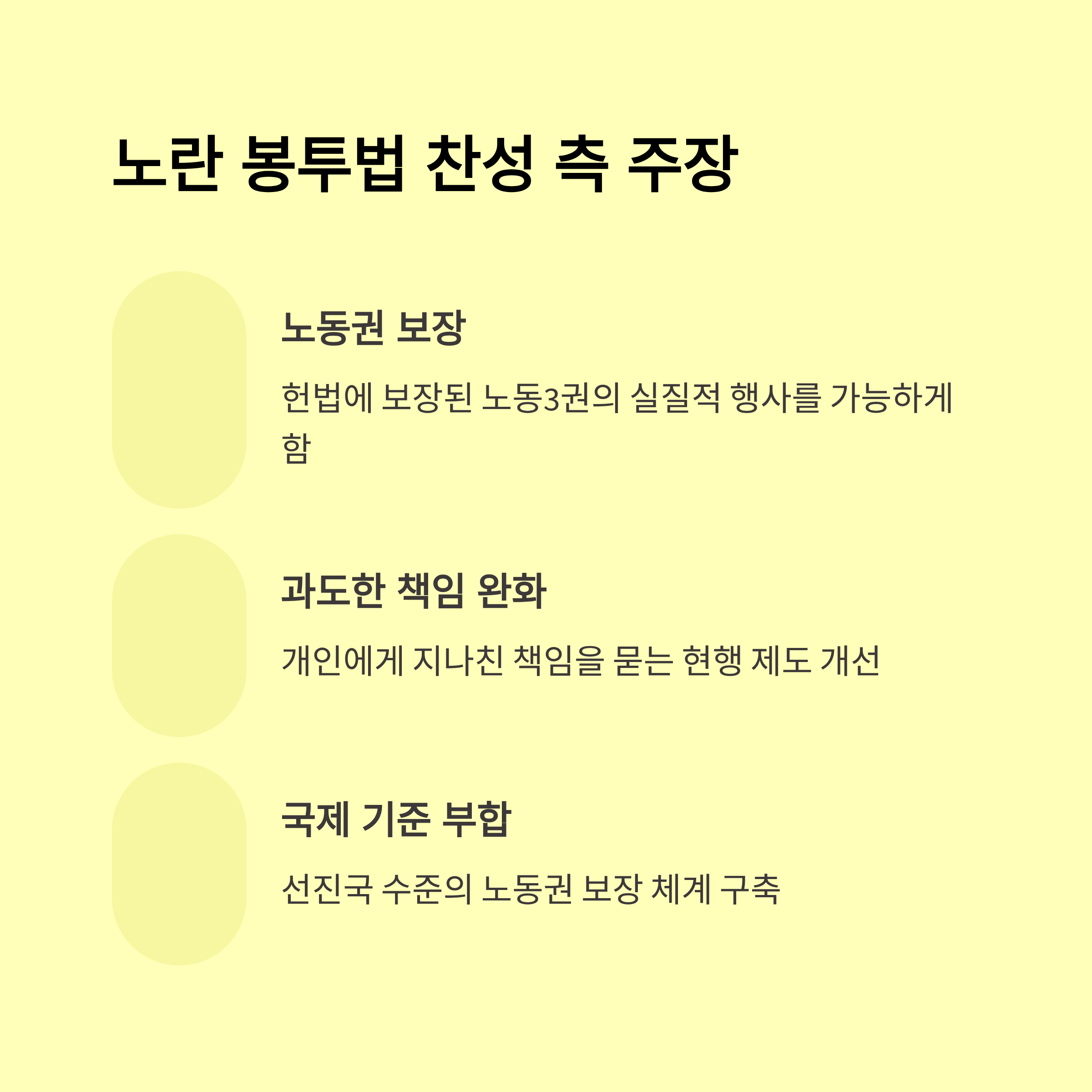 찬성하는 쪽은 노동자의 권리 강화와 무차별 손배소 피해 예방을 강조하지만, 반대 진영은 입법 피해가 경제 위주의 현실과 안 맞는다는 점을 강조합니다.
