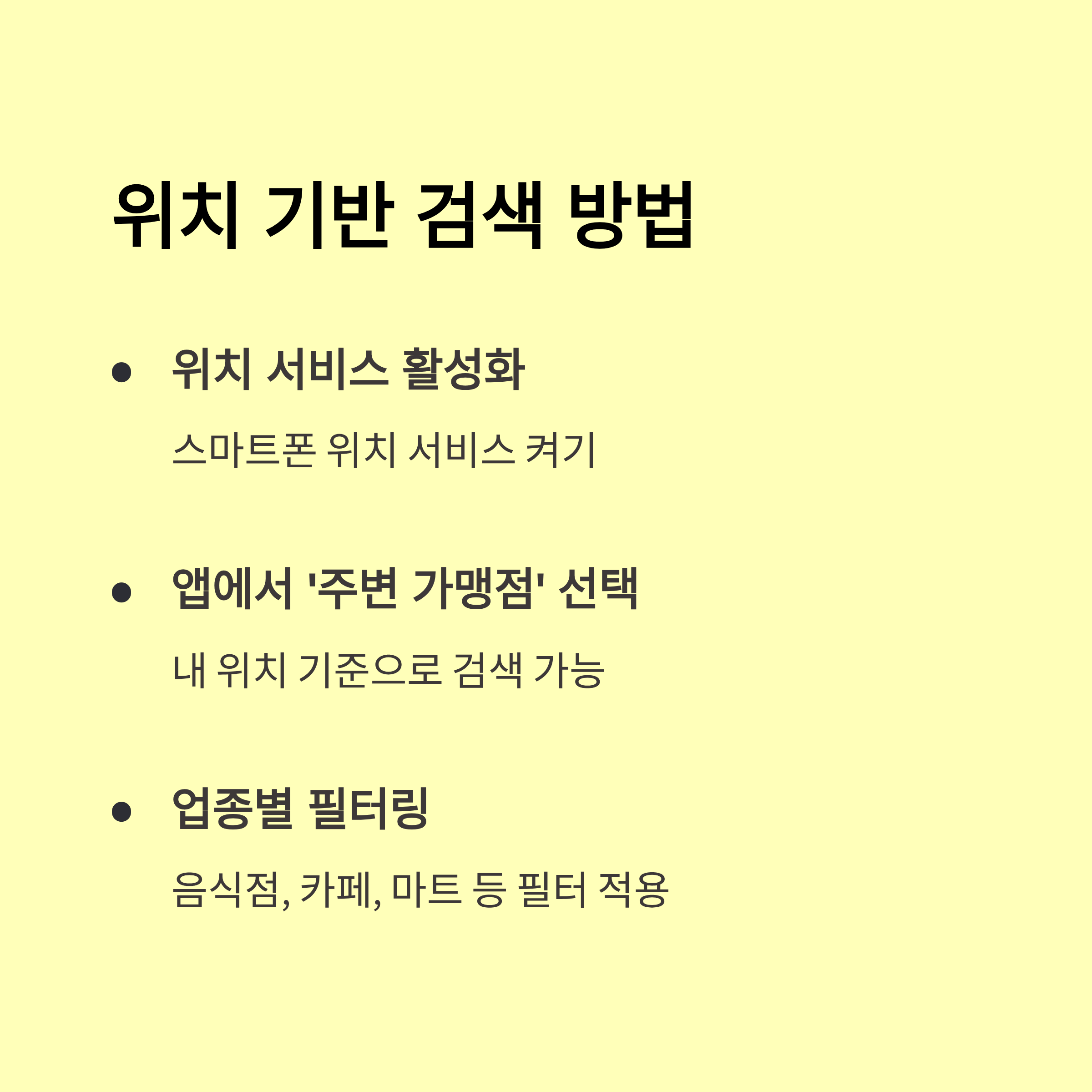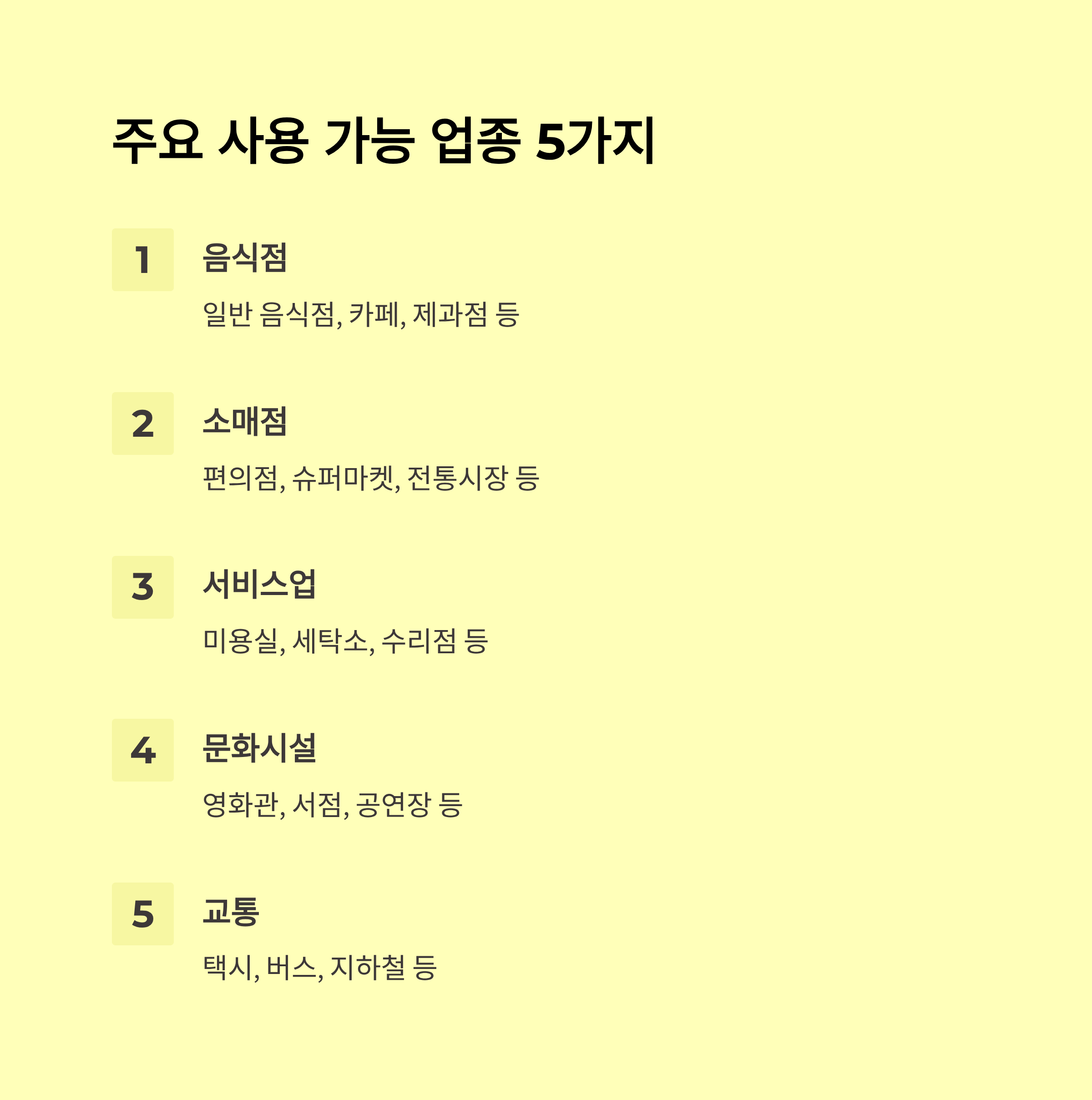 - 업종별 또는 지도에서 사용 가능한 가게를 쉽게 찾을 수 있습니다.