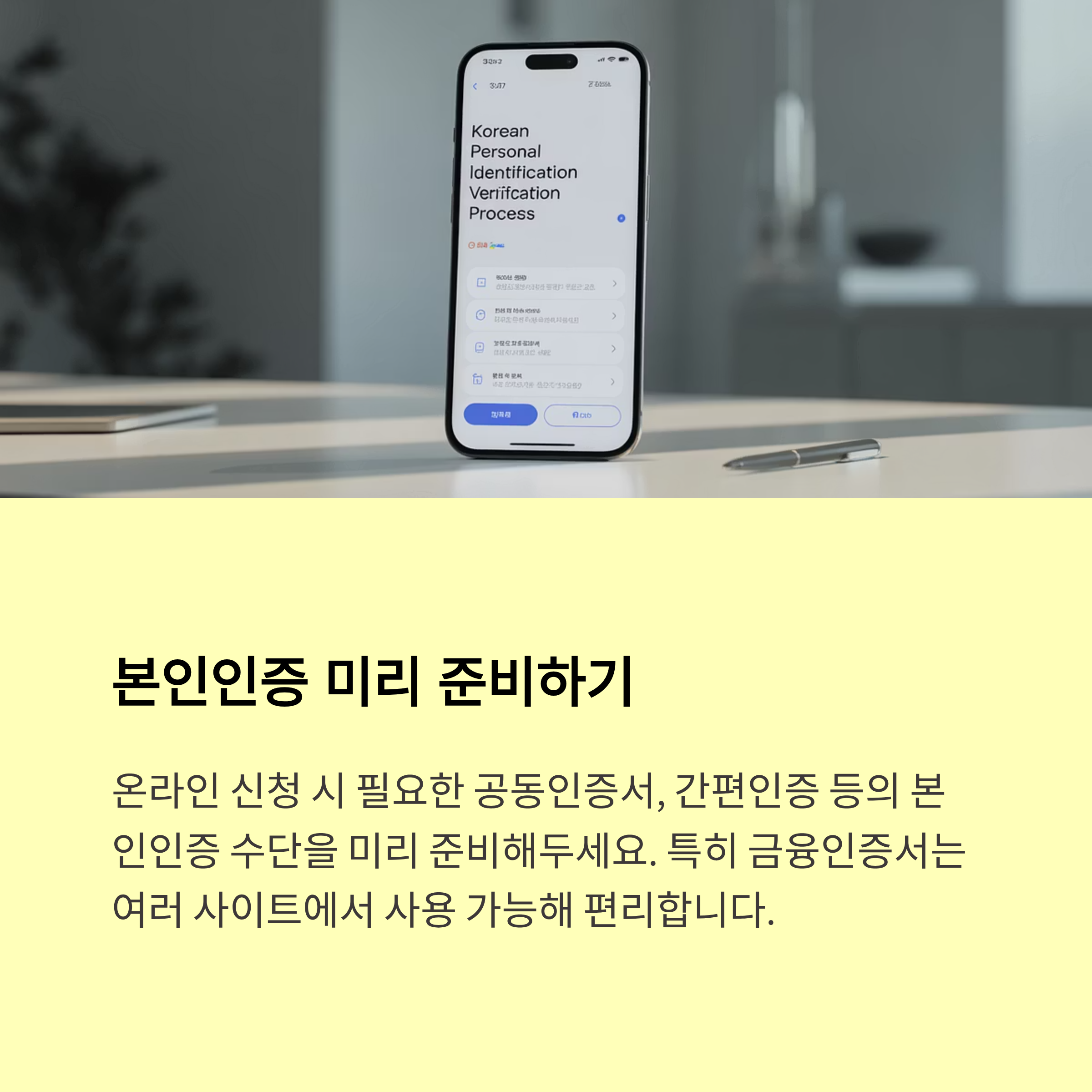두 번째는 ‘모바일 인증서’ 준비예요. 공동인증서 또는 간편인증(카카오, PASS, 삼성페이 등)을 미리 발급받아두면 신청 시 시간을 크게 줄일 수 있어요.