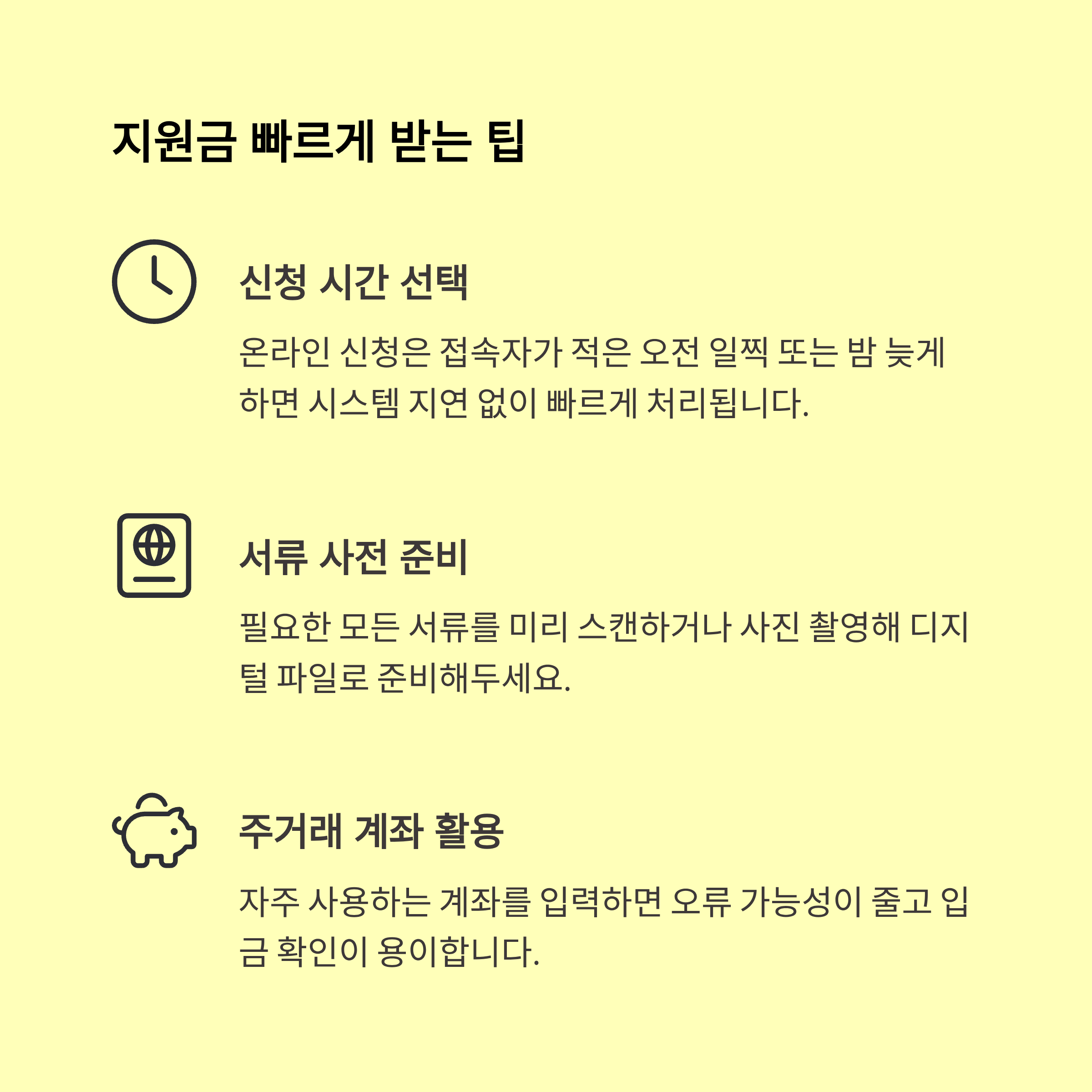 세 번째는 오류 없는 서류 제출이에요. 특히 계좌번호, 주민번호, 서류 스캔본 품질 등에서 오류가 많아요. JPG나 PNG보다는 PDF 제출이 안전하고, 300dpi 이상으로 스캔하면 정확도가 높아요.