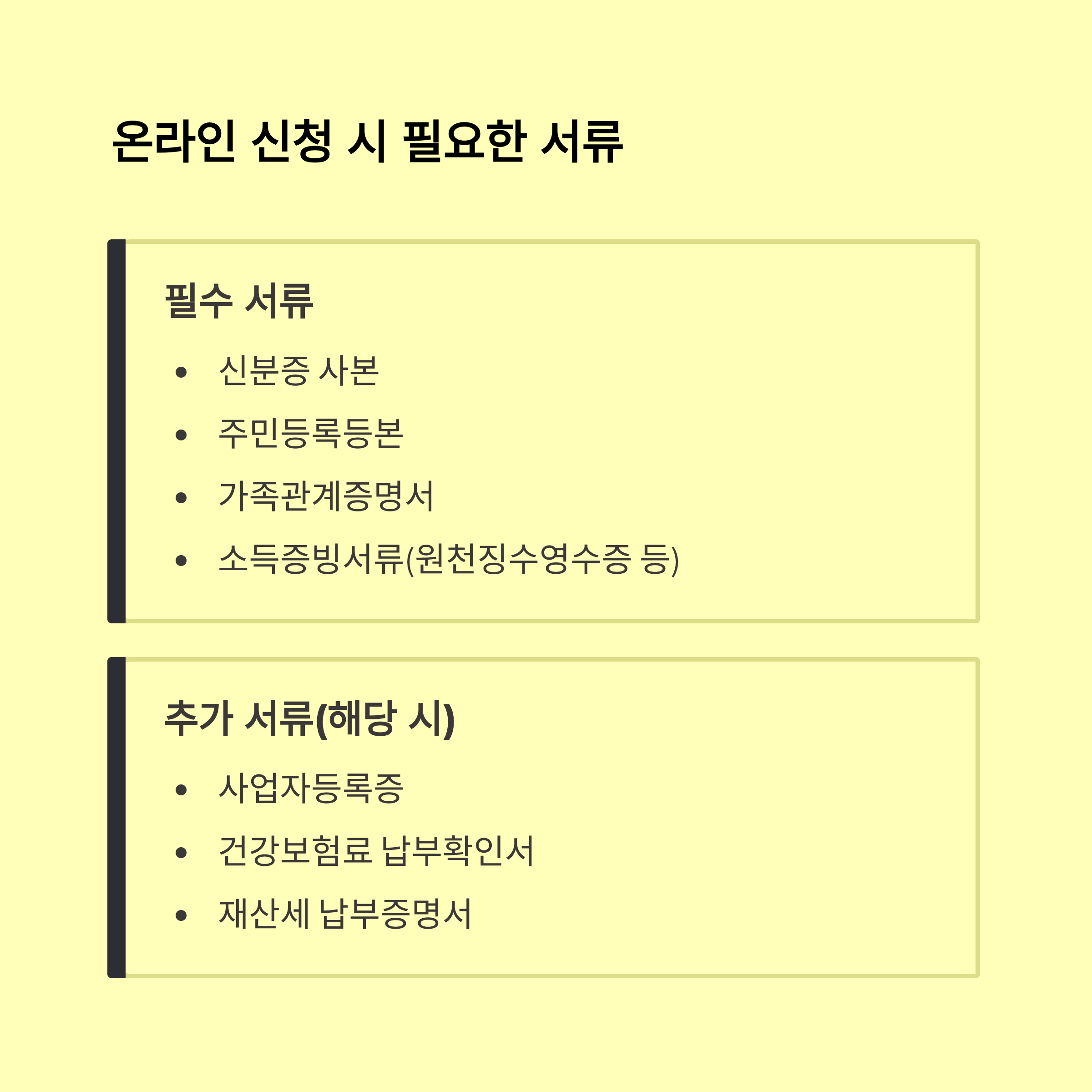 신청 시 필요한 서류는 대상에 따라 다르지만 기본적으로 신분증, 통장사본, 가족관계증명서, 건강보험료 납부 확인서가 있어요. 소상공인은 추가로 사업자등록증, 매출 감소 증빙자료가 필요해요.