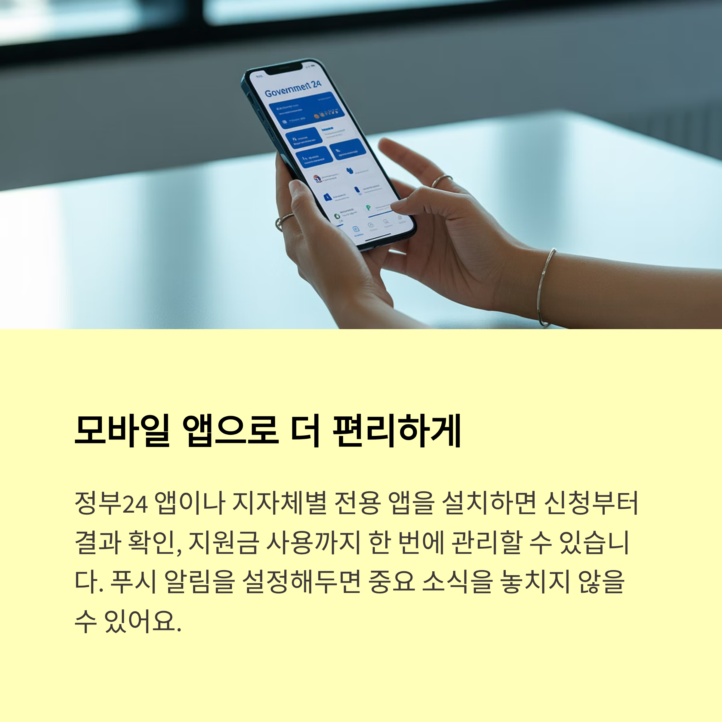 네 번째는 '알림 신청'이에요. 정부24 또는 해당 지자체에서 알림톡, 문자 수신을 신청해두면 심사 결과나 지급일 변경 등을 바로 받아볼 수 있어요. 이걸 해두면 놓치는 일이 줄어들어요.