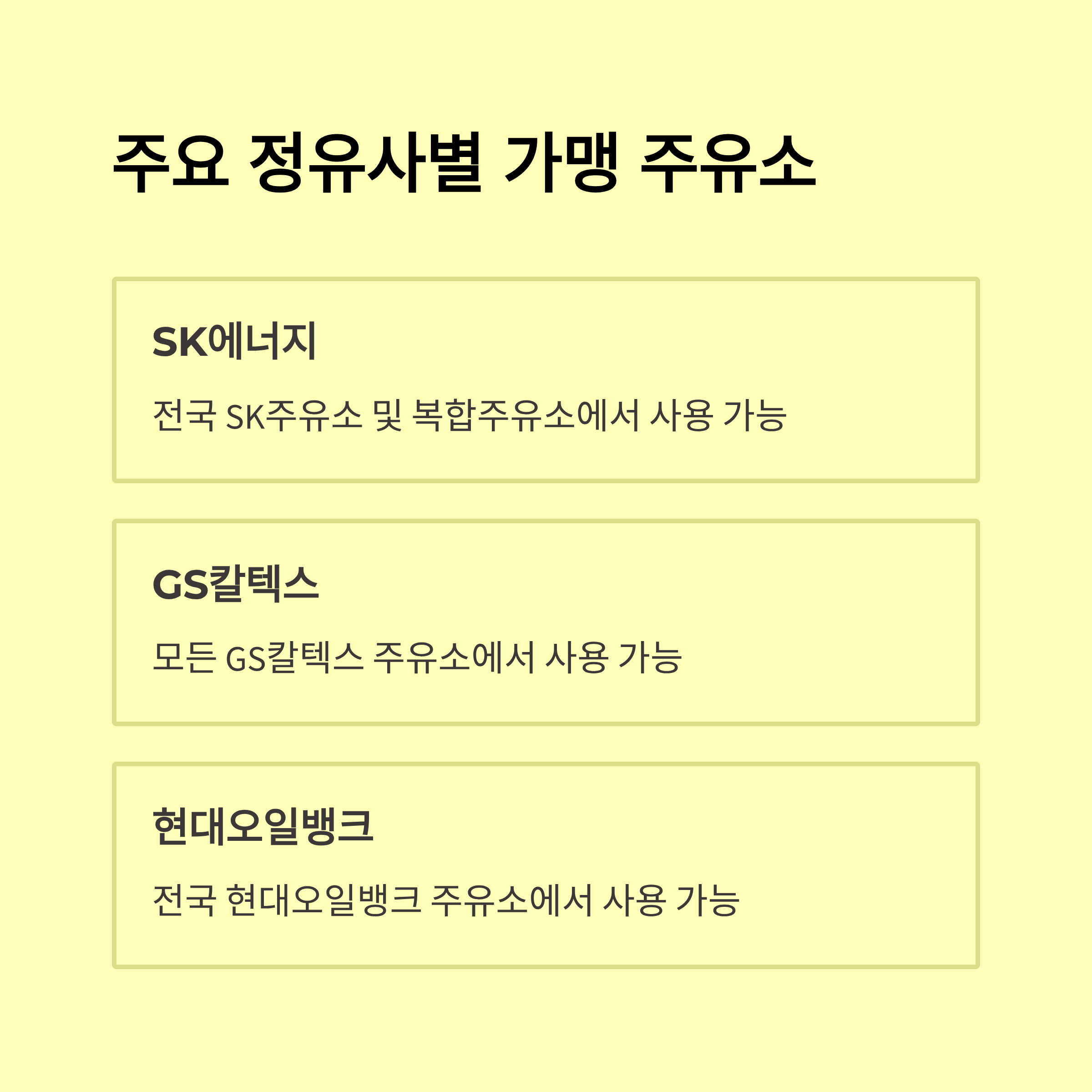 ⚠️ 하지만 SK에너지, GS칼텍스 등 대기업 계열 직영 주유소는 대부분 가맹이 되어 있지 않아요.