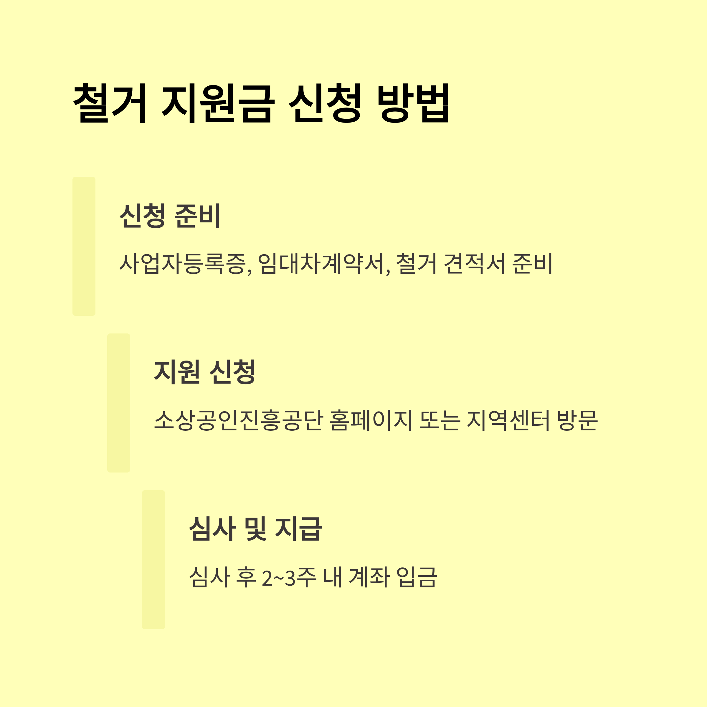 폐업철거지원금은 일반적으로 폐업신고 → 철거완료 → 서류제출 → 심사 → 지급 절차로 진행돼요. 순서를 바꾸거나 서류 누락 시에는 지급 거절될 수 있으니 꼭 순서대로 진행하는 게 중요해요.
