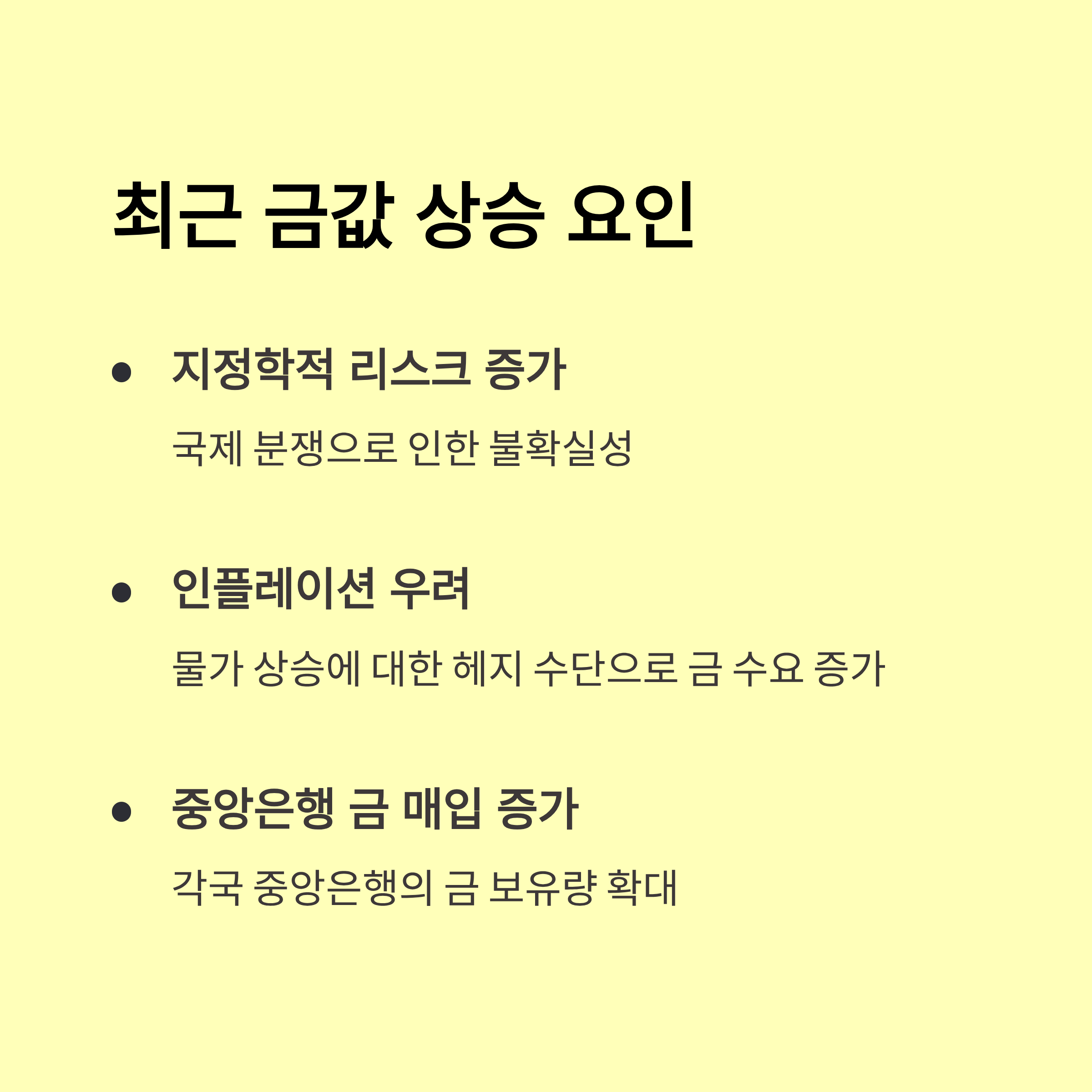 - 중동·유럽 지정학적 불안 요소가 국제 금 수요를 부추김