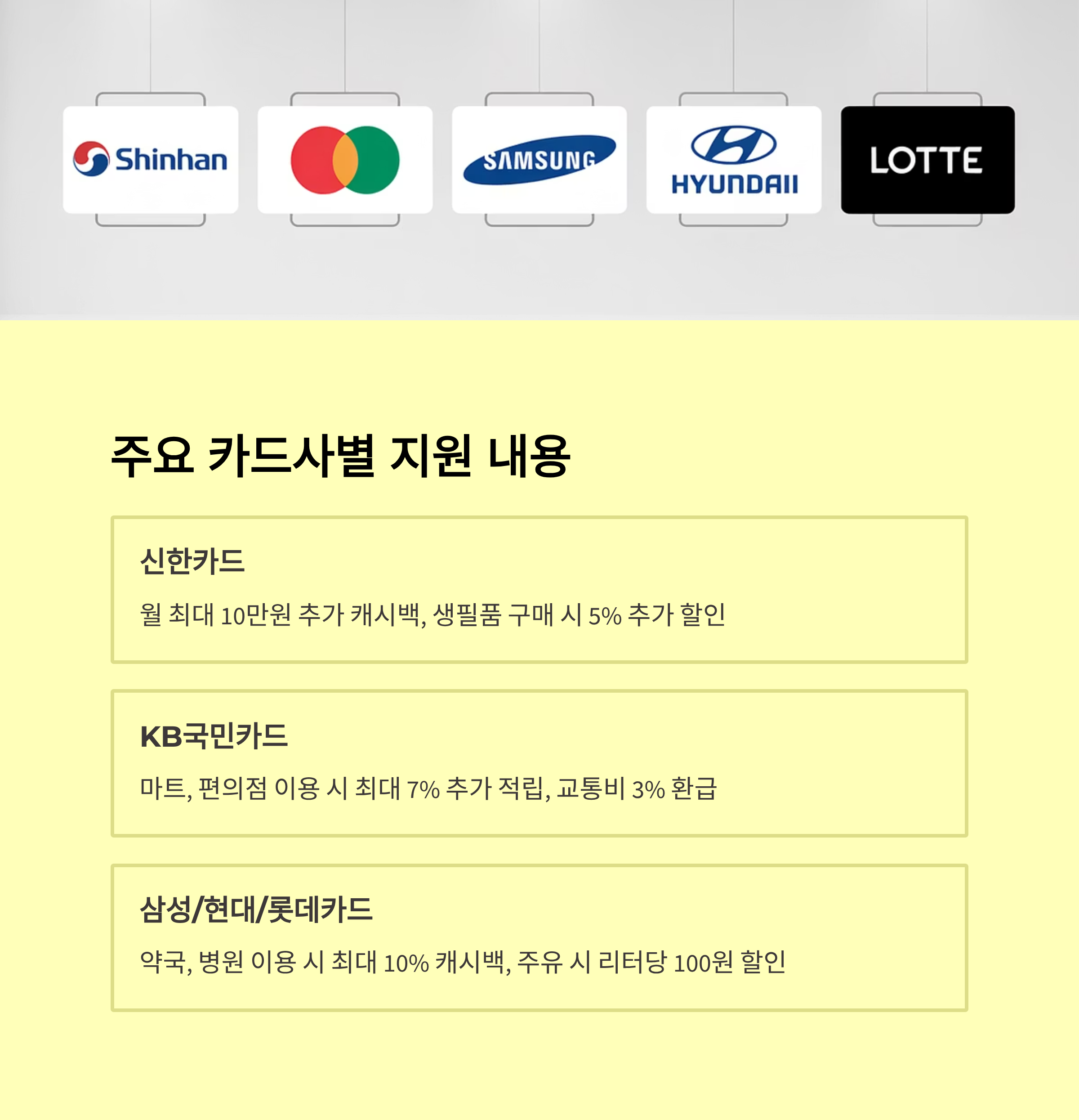 • 일반 가맹점(식당, 마트, 버스 등) → **10% 캐시백** • 대형마트·온라인 쇼핑몰 → **5% 캐시백**