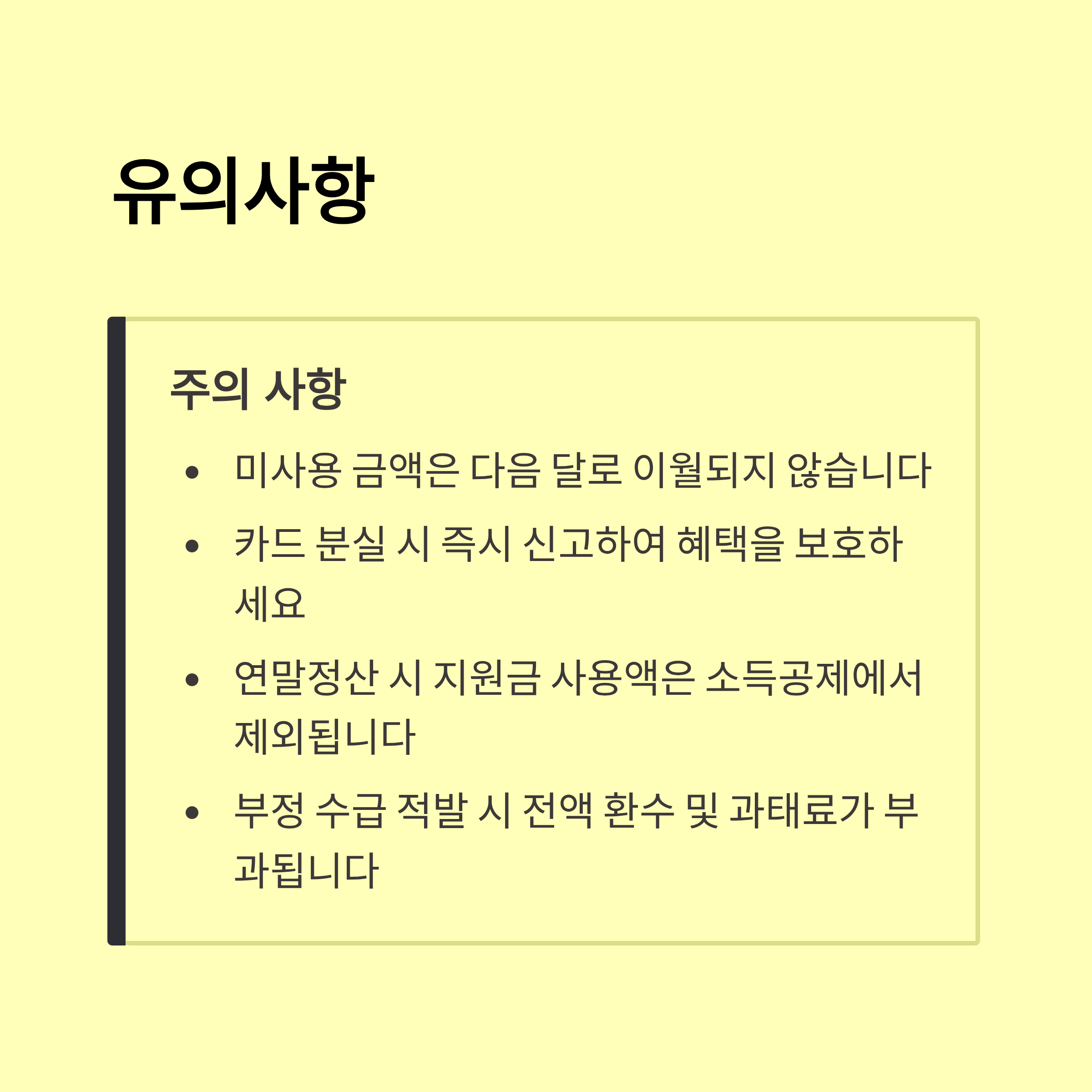 • 대중교통 / 편의점 / 식당 / 병원 / 교육비 등 일상 지출 위주로 체크카드 사용 추천! • 자동이체, 해외결제는 제외되니 주의!