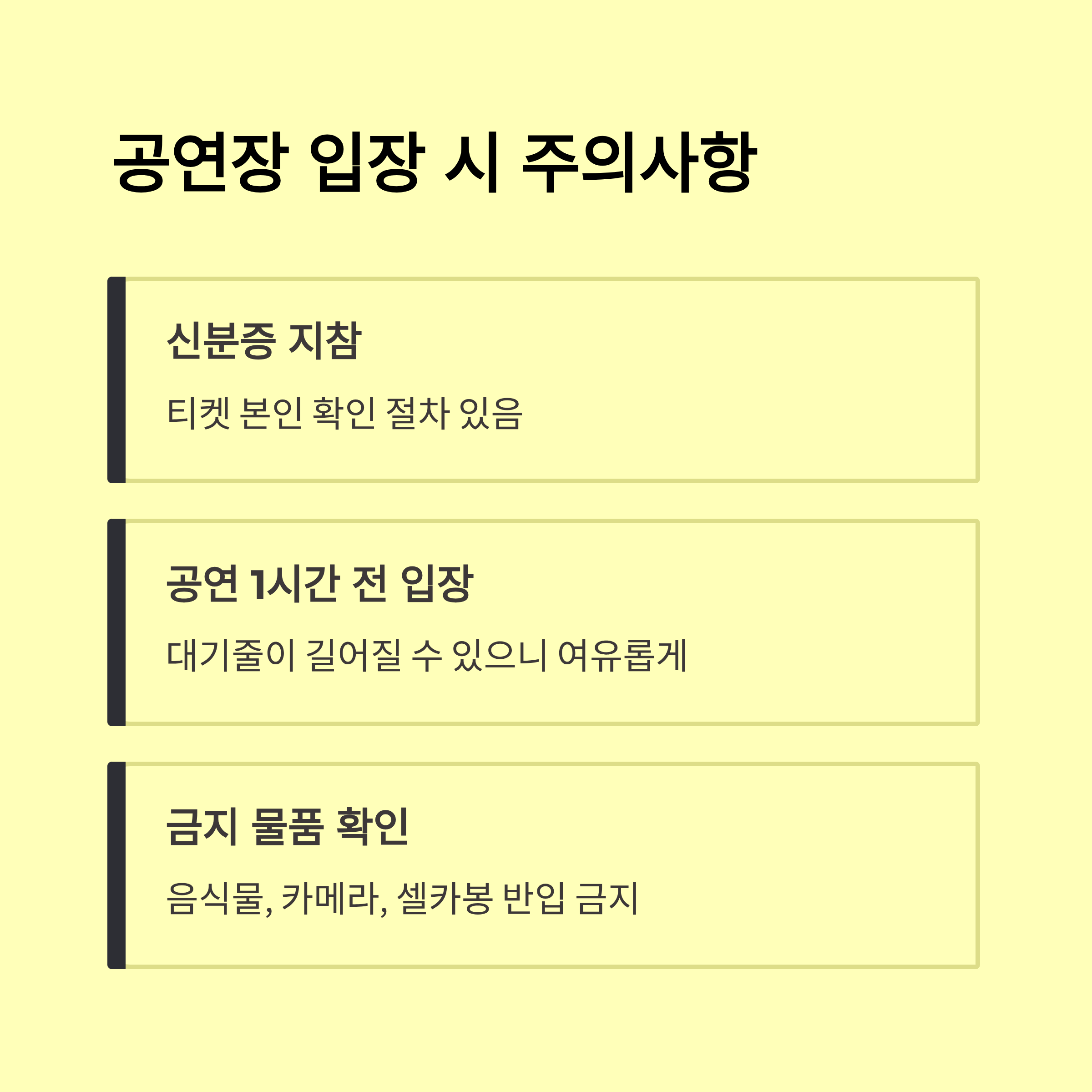- 공연장 입장 1시간 전 개방 / 30분 전까지 도착 권장