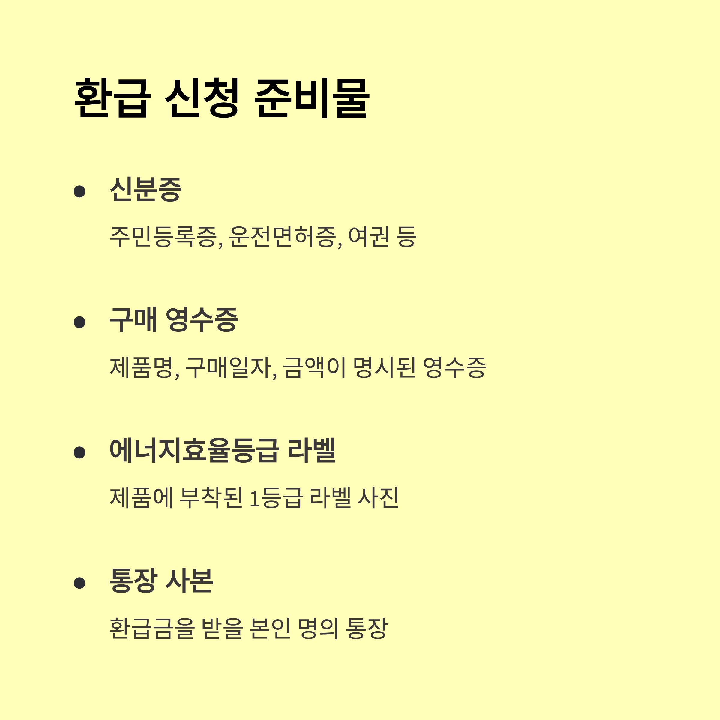 • 필수서류: 구매 영수증, 제품인증서(스티커·사진), 신분증/통장(본인명의)