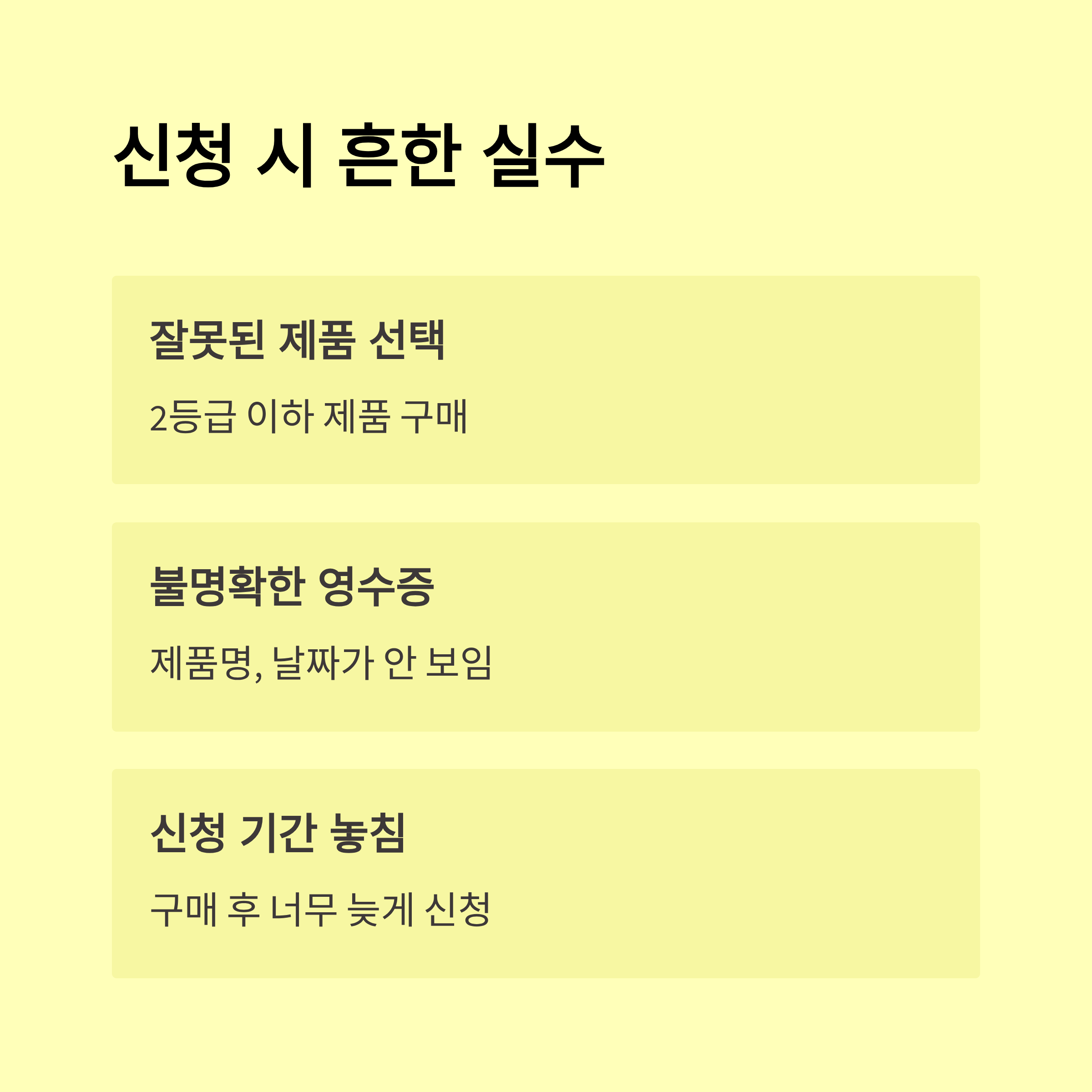 - 유의사항: 신청기한(구매 후 30일 이내) 엄수, 서류 오기재 트러블 주의