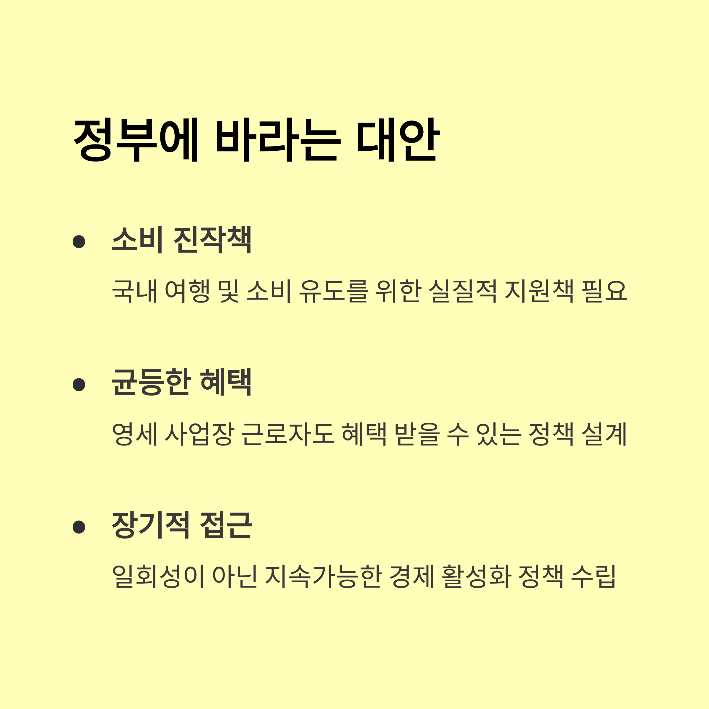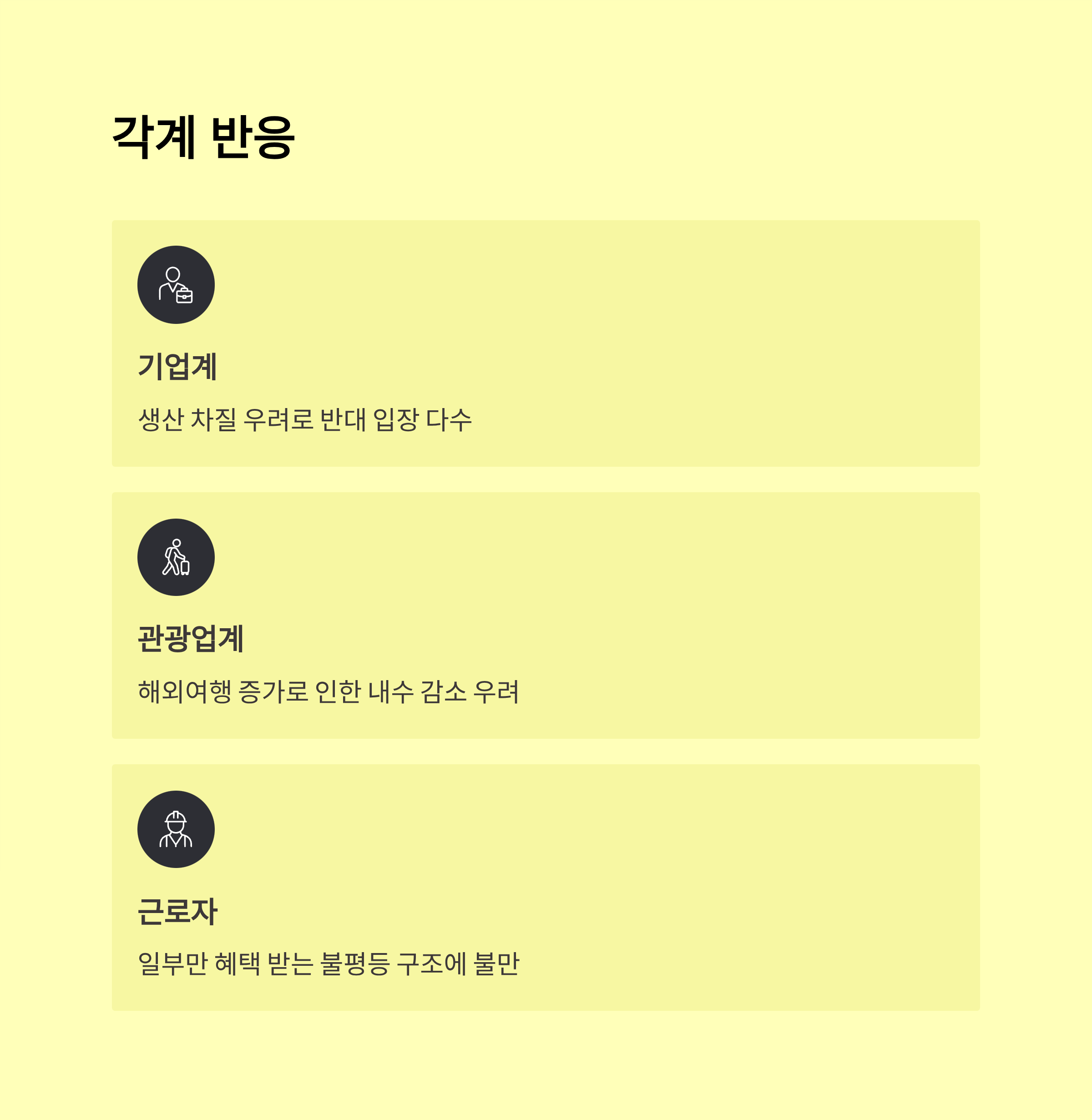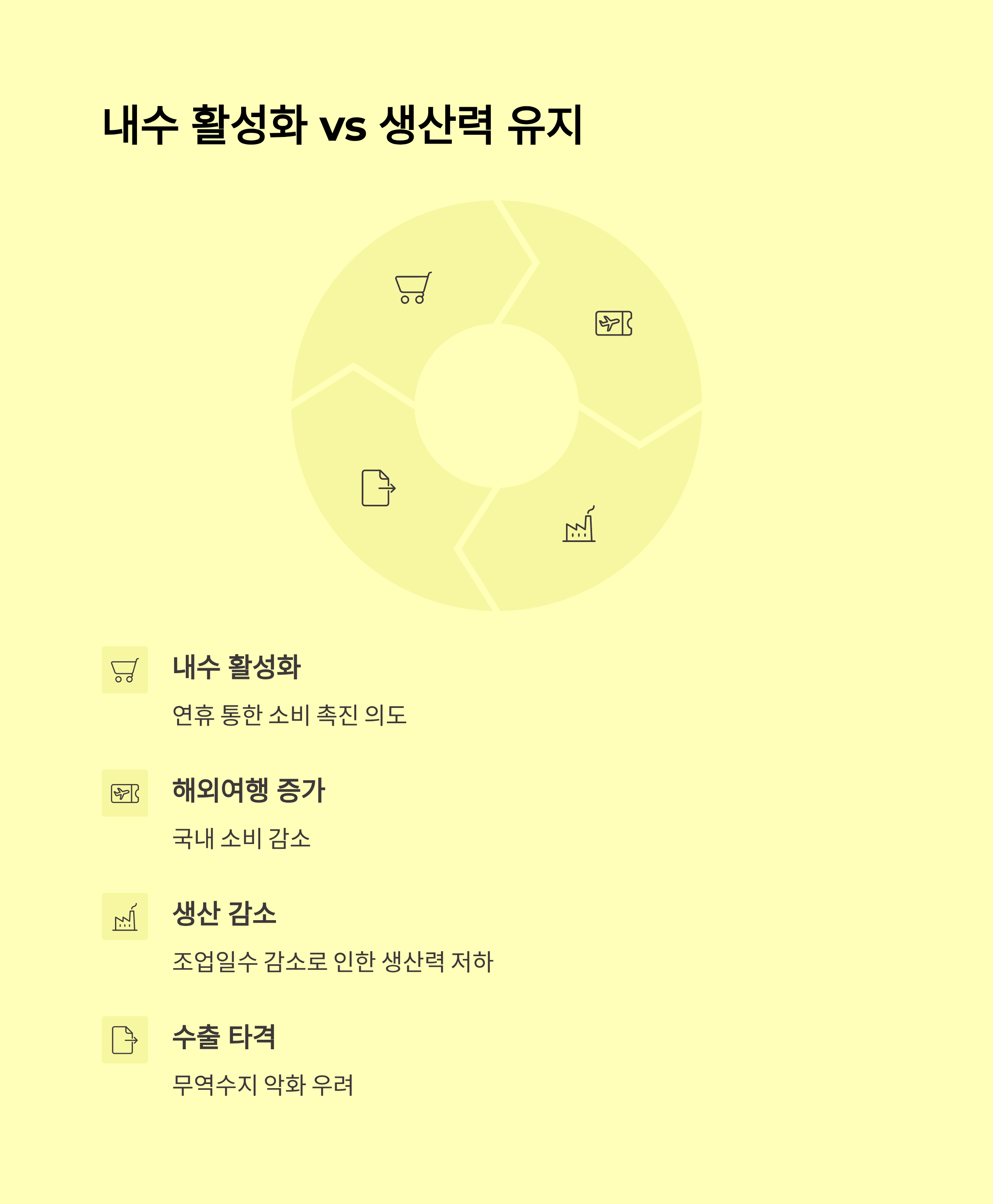 국내외 경기 환경 변화, 해외여행 증가에 따른 내수 영향, 고용 취약계층의 휴식권 문제 등 다양한 사회경제적 이슈가 엮여 있어 정부와 국민 모두가 지속적인 정보 공유와 협력이 요구됩니다.