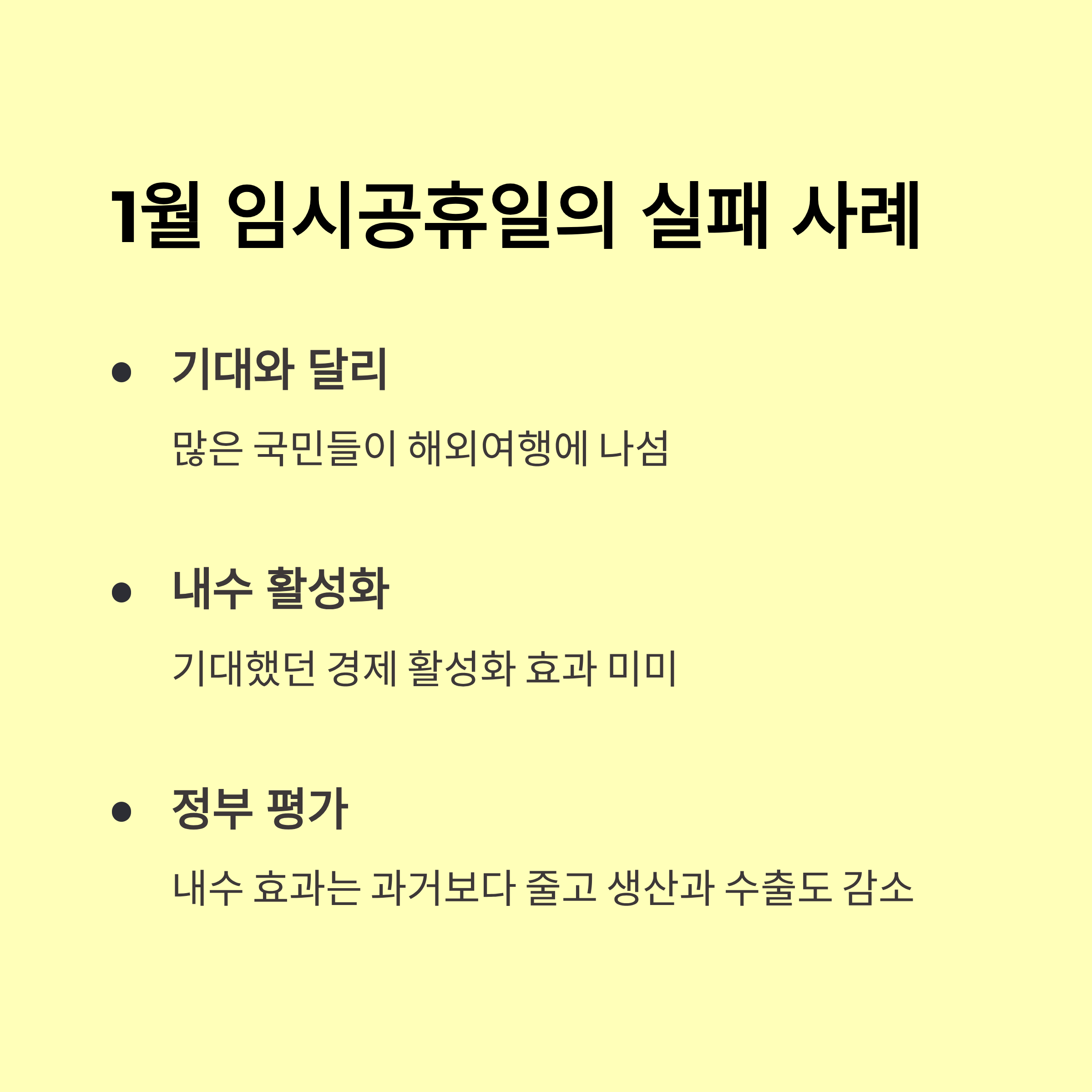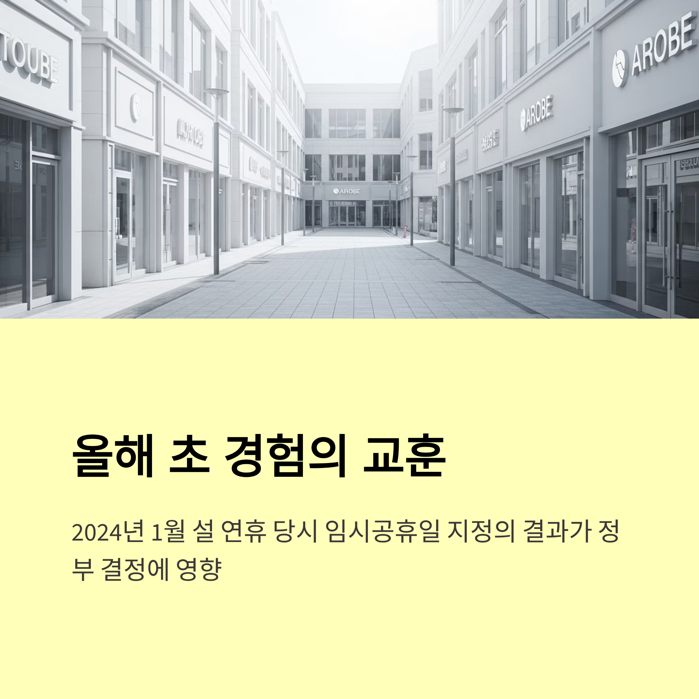 이 조치는 2025년 설 연휴 당시 임시공휴일 지정 후 나타난 긍정적 내수 효과 미비와 경제 생산성 저하 경험을 바탕으로 한 현실적 판단으로 풀이됩니다.