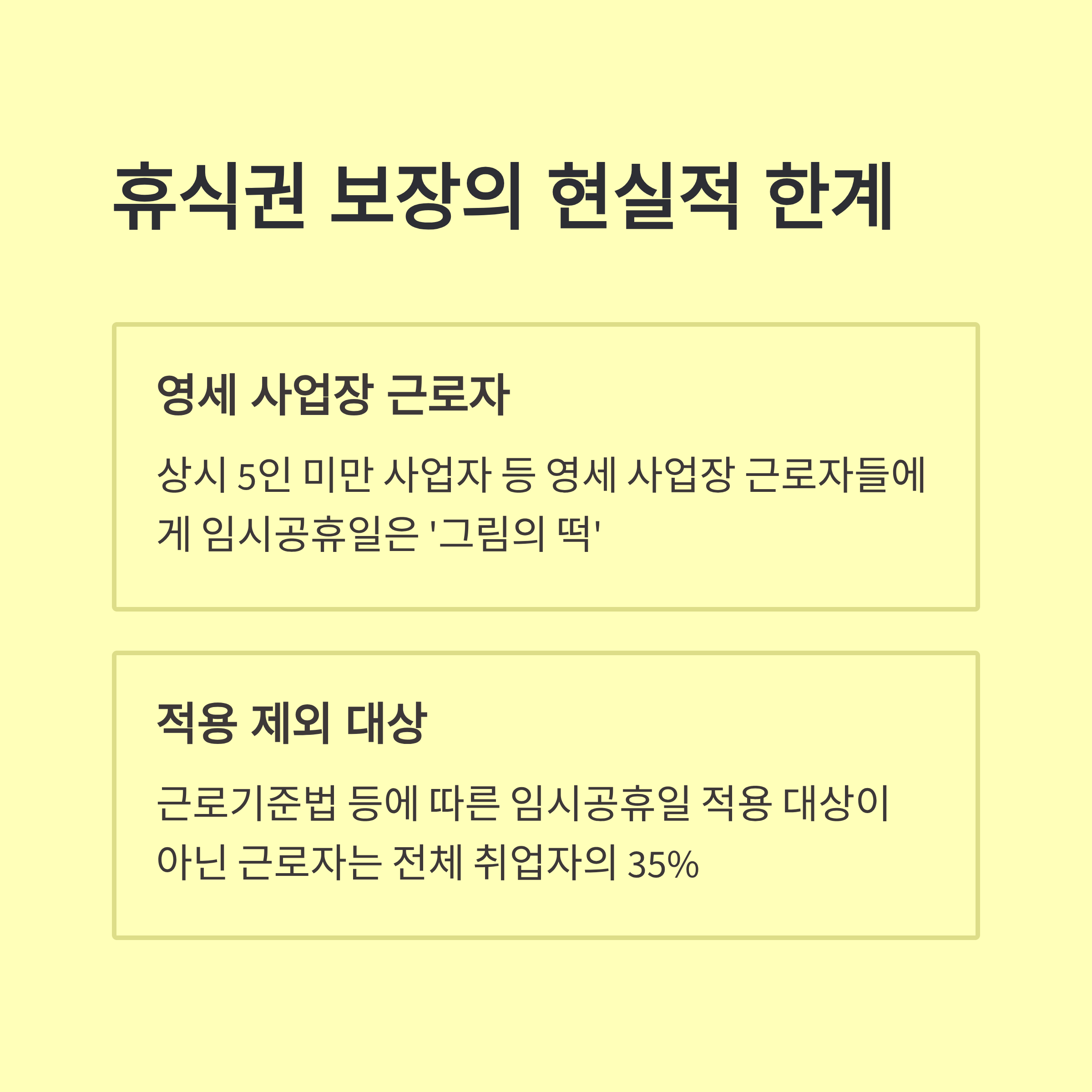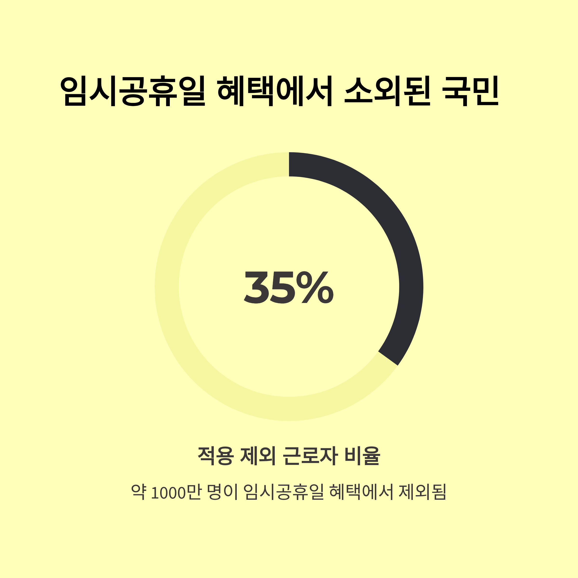 우리나라 전체 취업자 중 약 35%에 달하는 1000만 명은 상시 5인 미만 사업장 근로자 등으로 임시공휴일이 적용되지 않습니다. 이들 소외계층의 휴식권 보장에 한계가 존재한다는 지적이 꾸준히 제기되고 있습니다.
