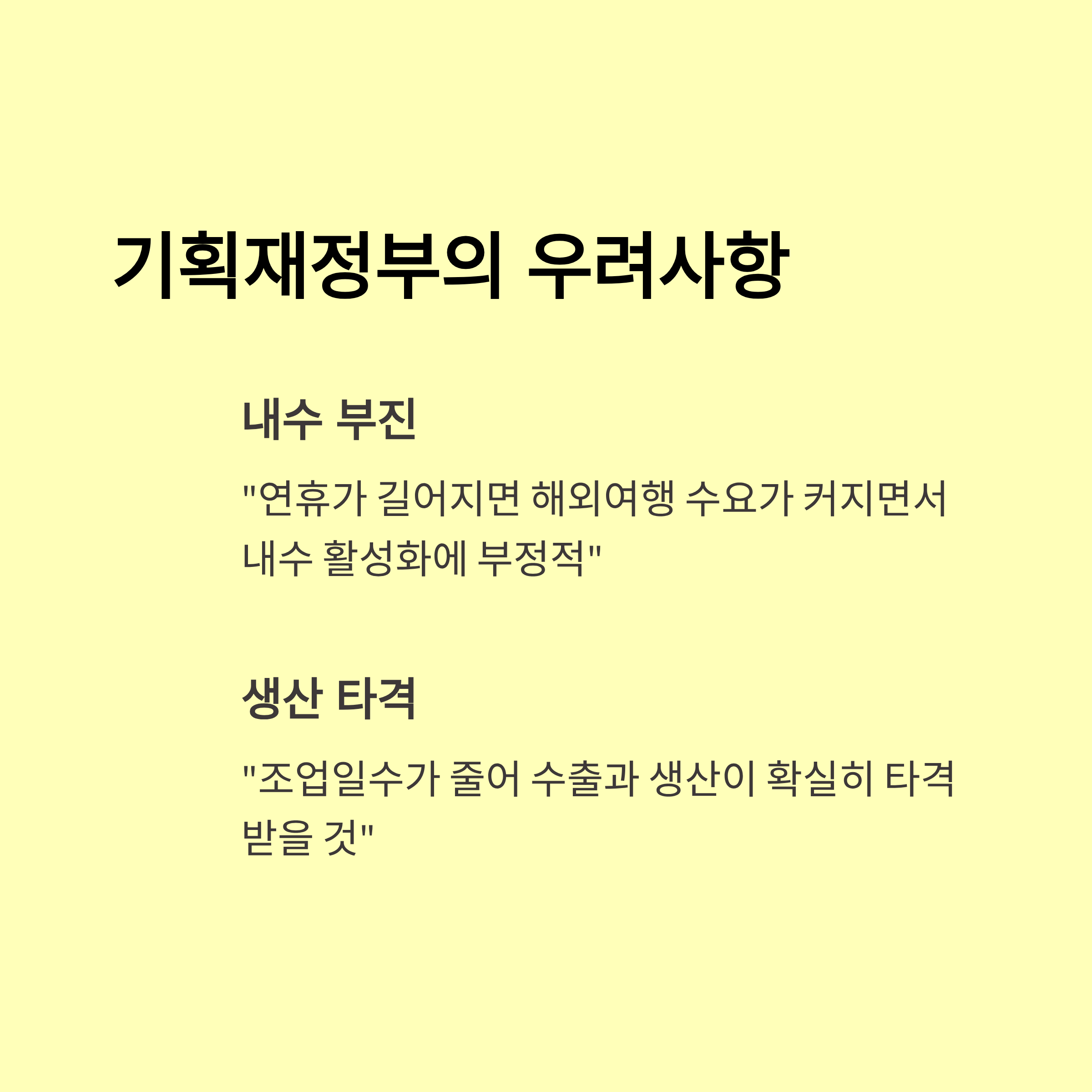 기재부 관계자는 “연휴가 길어질 경우 오히려 해외여행 수요가 폭증해 내수 활성화에는 역효과가 크다”며 임시공휴일 지정 불가 인식을 분명히 했습니다. 또한, 조업일수 감소에 따른 수출과 생산 부문 타격 우려도 크다고 밝혔습니다.