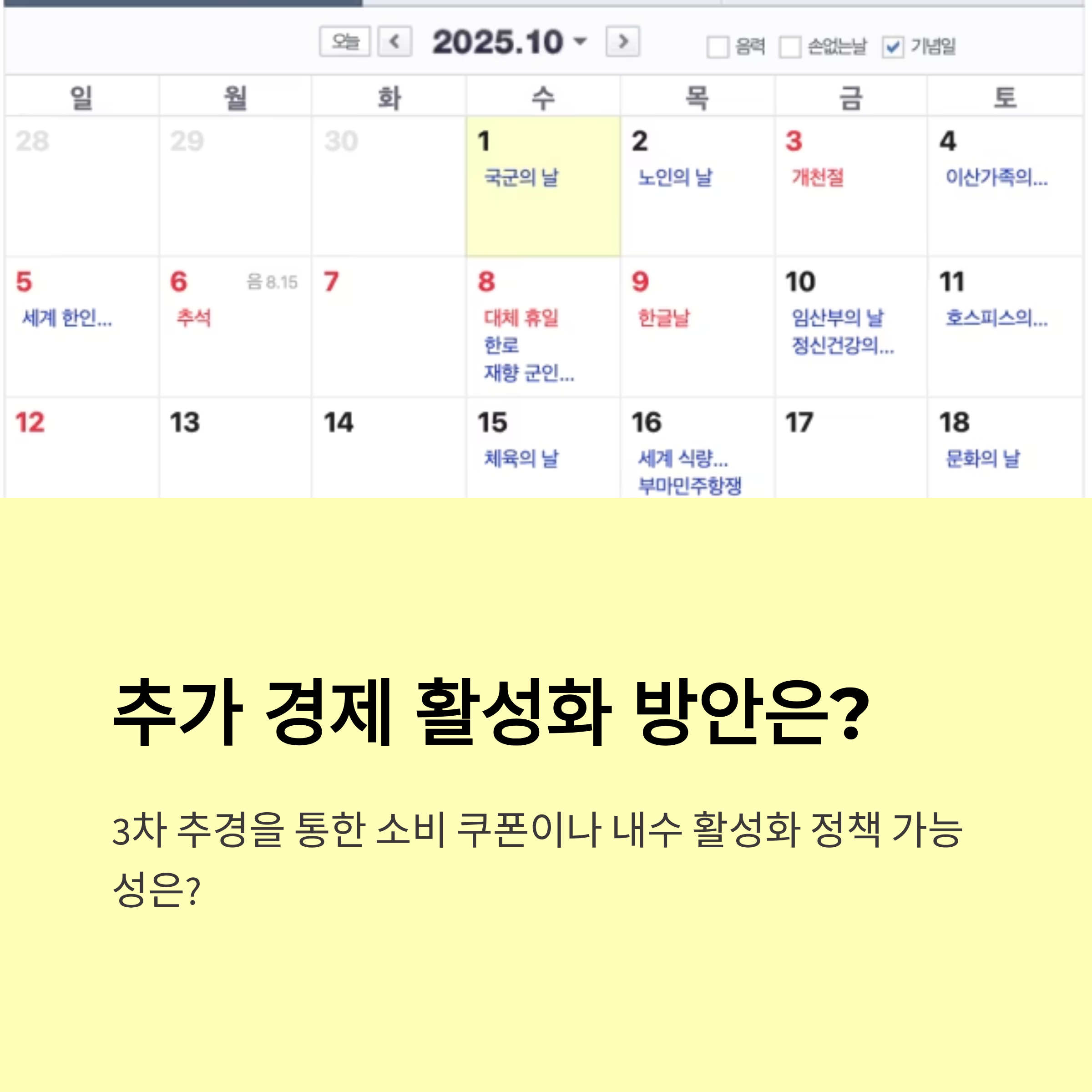 정부는 임시공휴일 지정 대신 3차 추가경정예산(추경)을 통한 소비 쿠폰 지급 등 내수 활성화 방안을 추진 중이나, 예산 현실성과 정책 효과에 대한 우려가 감돌고 있습니다. 특히 내년도 예산 제출 직전인 상황에서 3차 추경 편성은 쉽지 않으며 연내 기존 재원 소진이 우선시되고 있습니다.