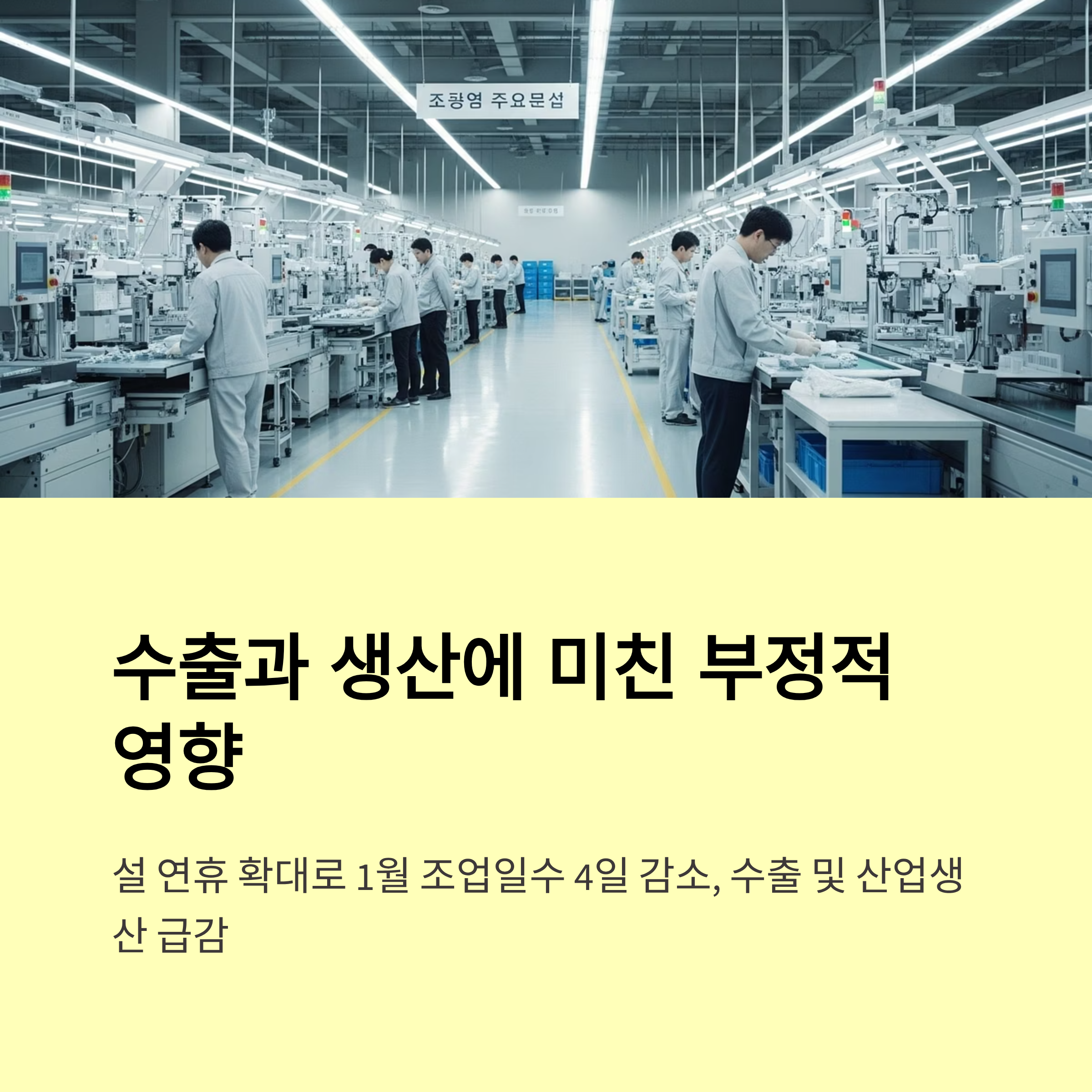 지난 1월 임시공휴일 지정으로 인해 설 연휴가 3일에서 6일로 늘어나면서 조업일수가 4일이나 줄었습니다. 이로 인해 1월 수출은 전년 동월 대비 10.2% 급감했고, 산업 생산은 광공업, 서비스업, 건설업 등 전반적으로 감소하는 부정적 영향을 받았습니다.