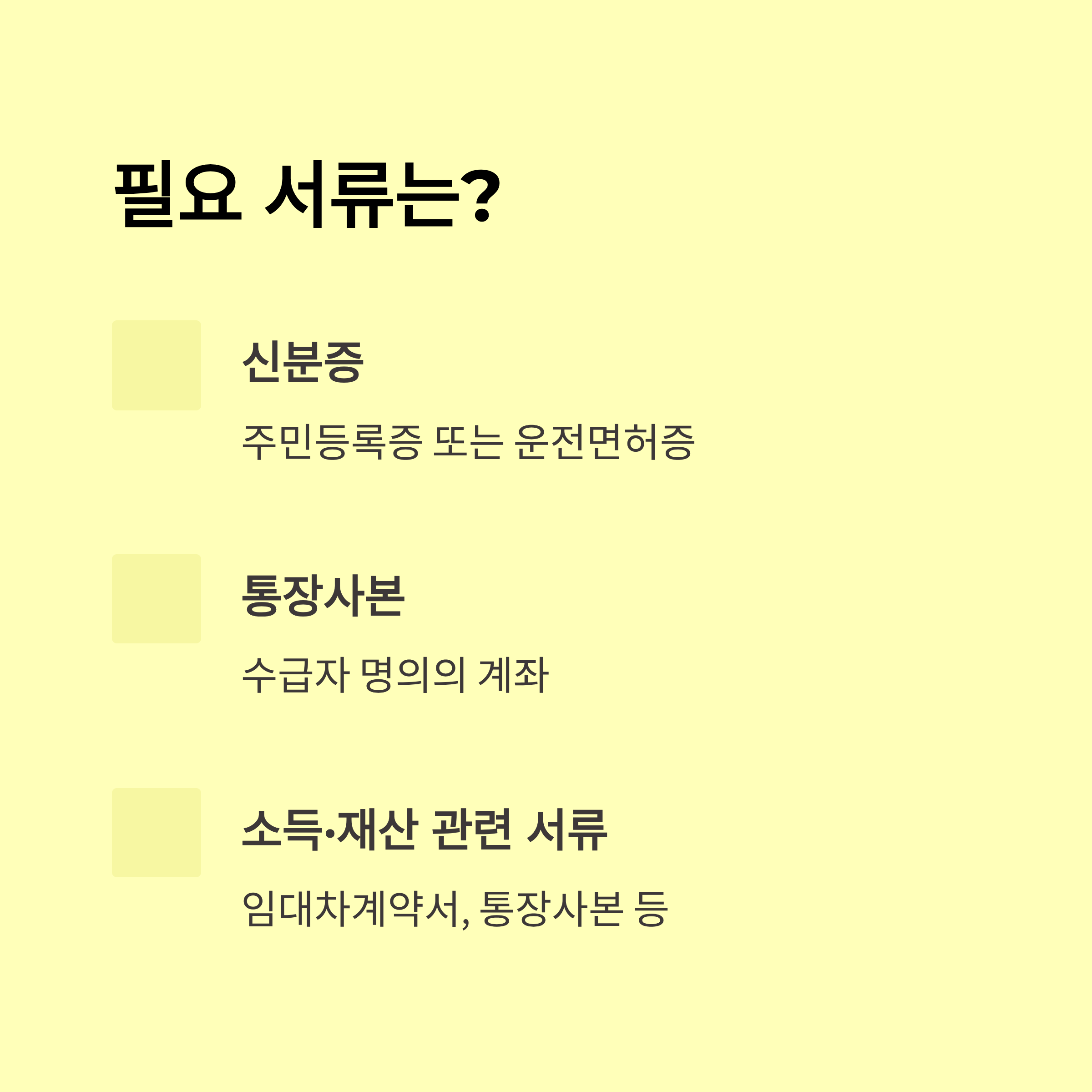 - 필요 서류: 신분증, 통장 사본(계좌번호), 최근 소득 및 재산내역 관련 증빙서류(필요시)