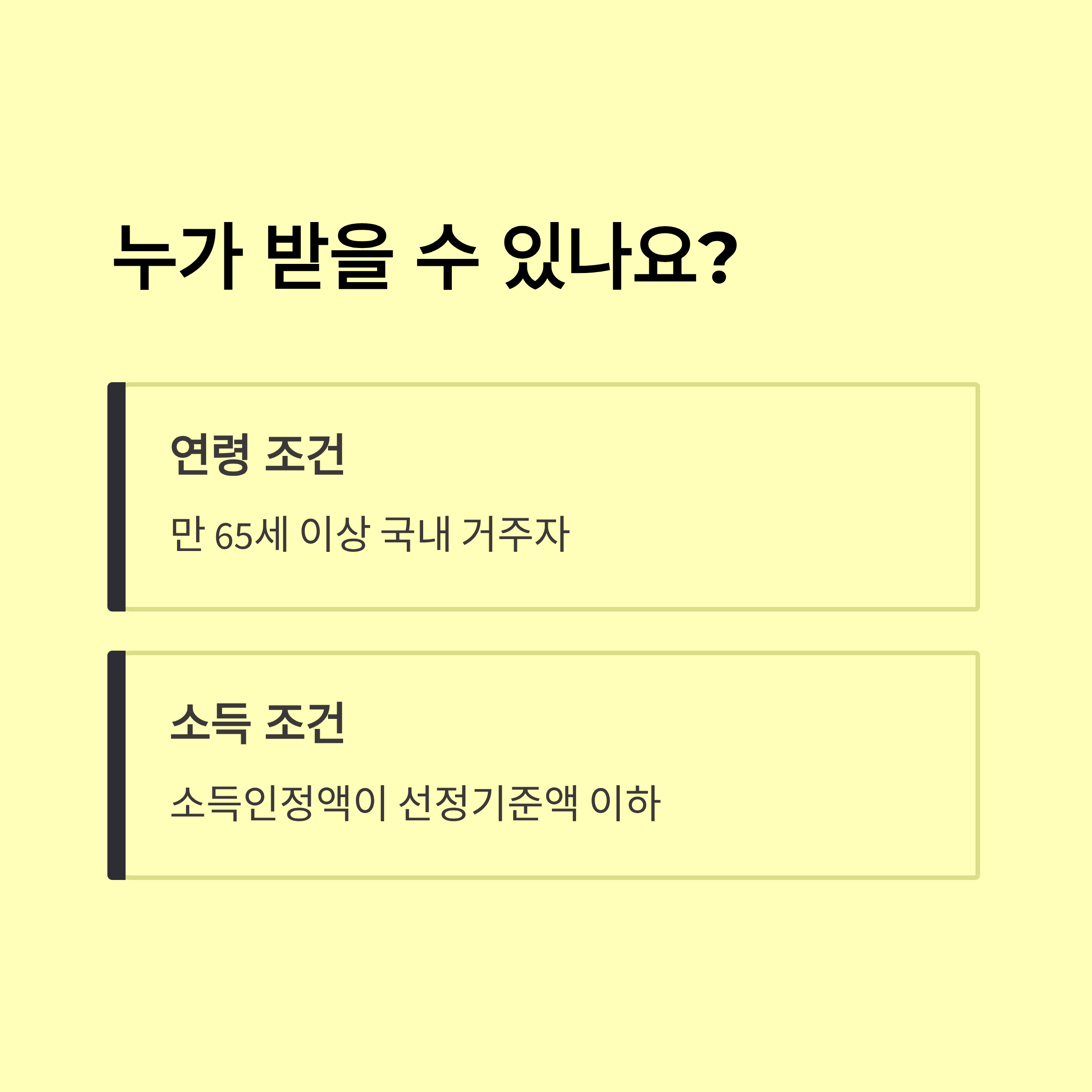 - 연령 요건: 만 65세 이상 국내 거주자(국적 취득 연령 제한 없음, 외국인은 일부 예외적 적용)