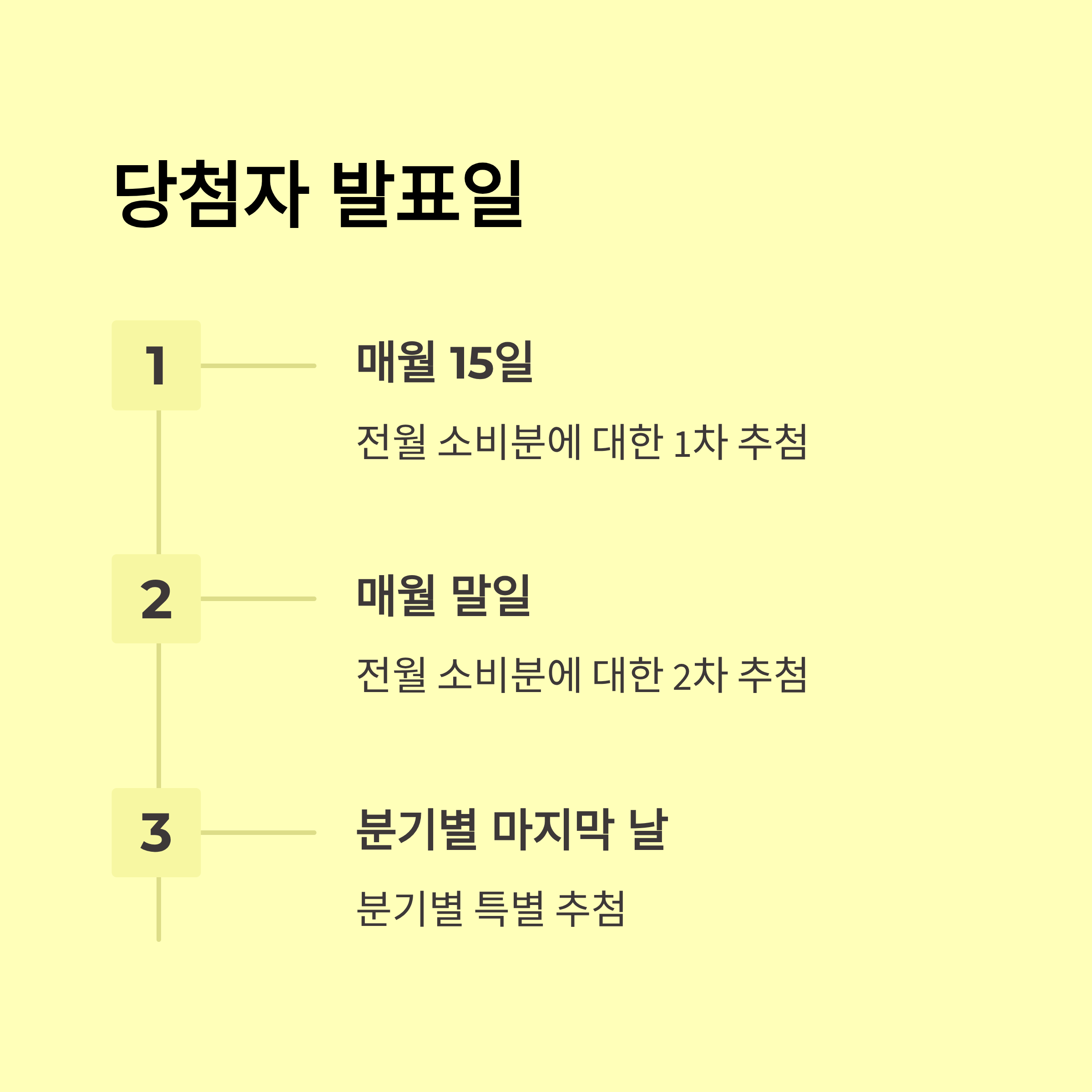 - 당첨 확률은 소비자 실적(매출), 신청 시기, 신청 채널, 응모 횟수 등에 따라 차이가 있음